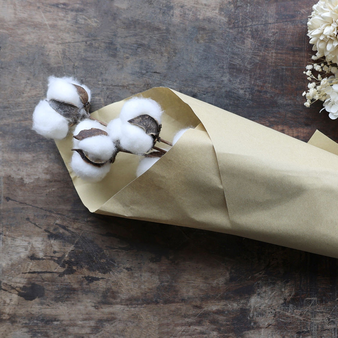 Mit 10 voluminösen Baumwollkugeln und liebevoll in braunes Papier eingewickelt ist dieses stilvolle Bouquet ideal für moderne wie auch für Vintage-Einrichtungen.