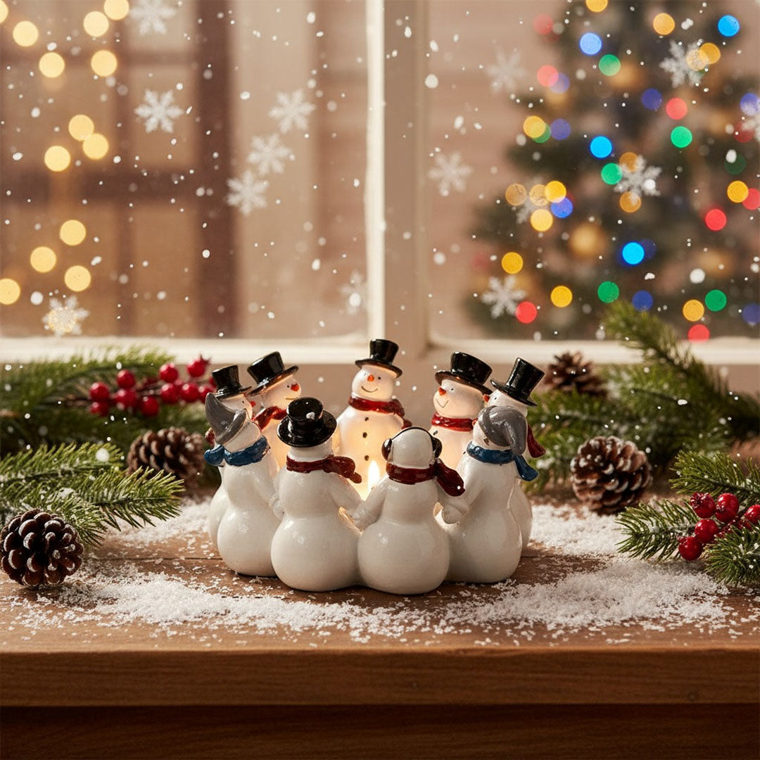 Bringen Sie den Zauber des Winters in Ihr Zuhause mit diesem charmanten Schneemannring von Harvesttime. Die Figur zeigt eine fröhliche Runde von Schneemännern, die sich an den Händen halten und Platz für ein Teelicht in der Mitte lassen. Ange zündet verbreitet es eine gemütliche und warme Atmosphäre an kalten Winterabenden.