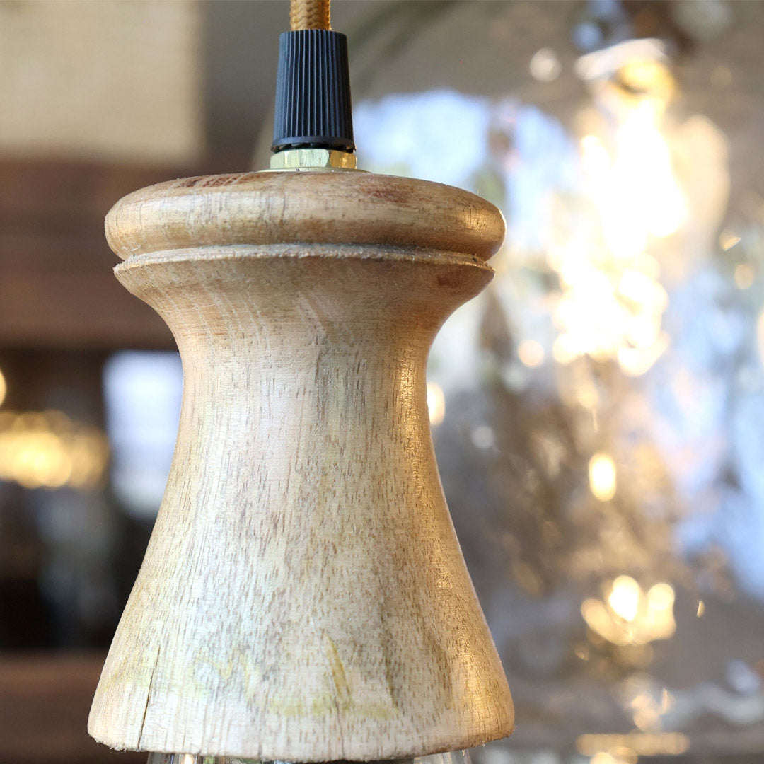 Eine dekorative Lampe, bei der natürliches Mangoholz auf elegantes Glas trifft. Der klare Glasschirm sorgt für ein leichtes und modernes Erscheinungsbild, während der Holztop Wärme und einen nordischen Akzent verleiht.