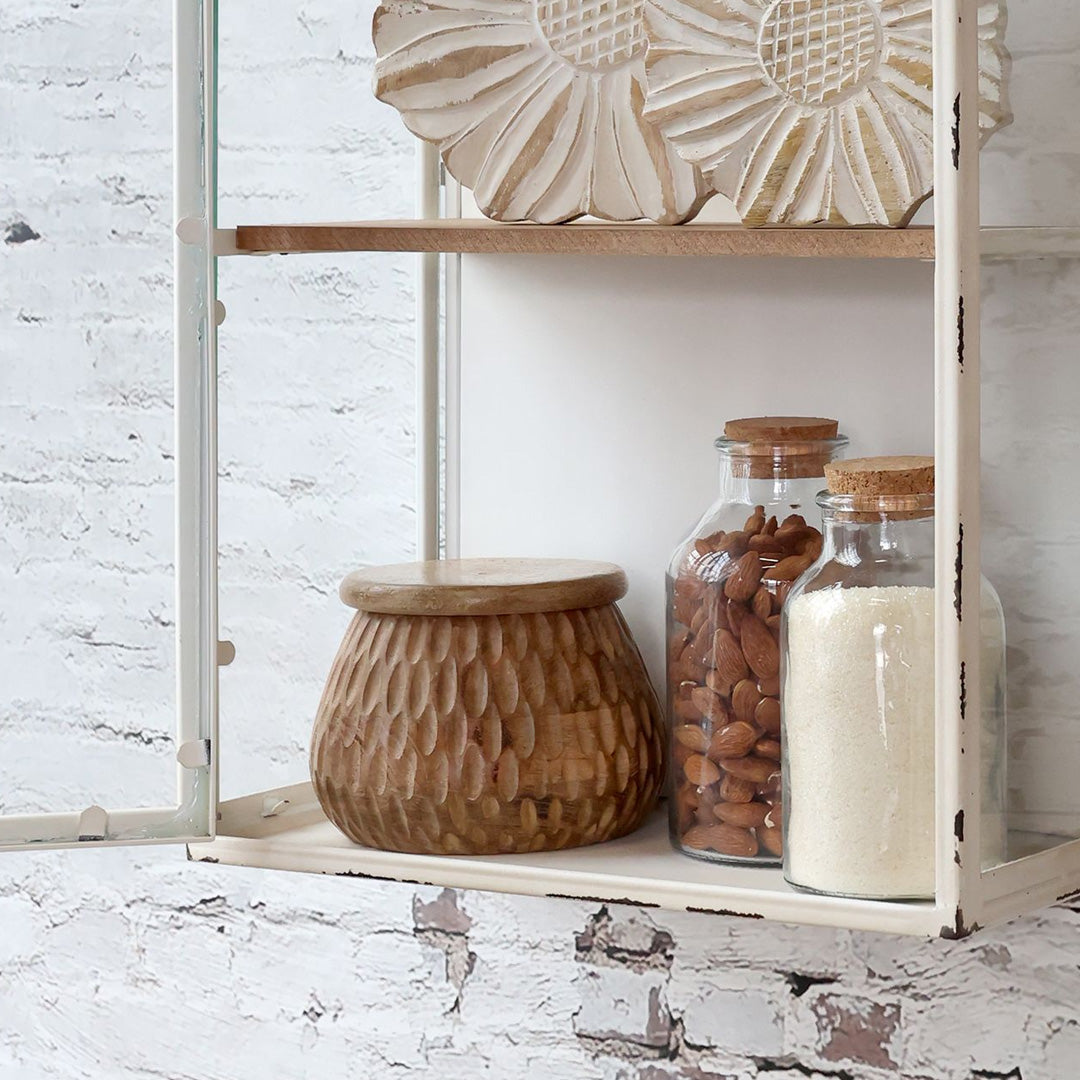 Gefertigt aus massivem Mangoholz mit handgeschnitztem Muster und einer sanft naturfarbenen Oberfläche, passt sie perfekt in Küche, Bad oder Schlafzimmer.