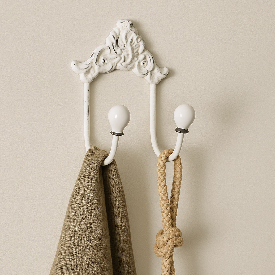 Der Haken ist aus robustem Eisen und Porzellan gefertigt und verfügt über zwei funktionale Knäufe mit weißen Porzellankugeln, die nicht nur dekorativ sind, sondern auch schonend zu Textilien.