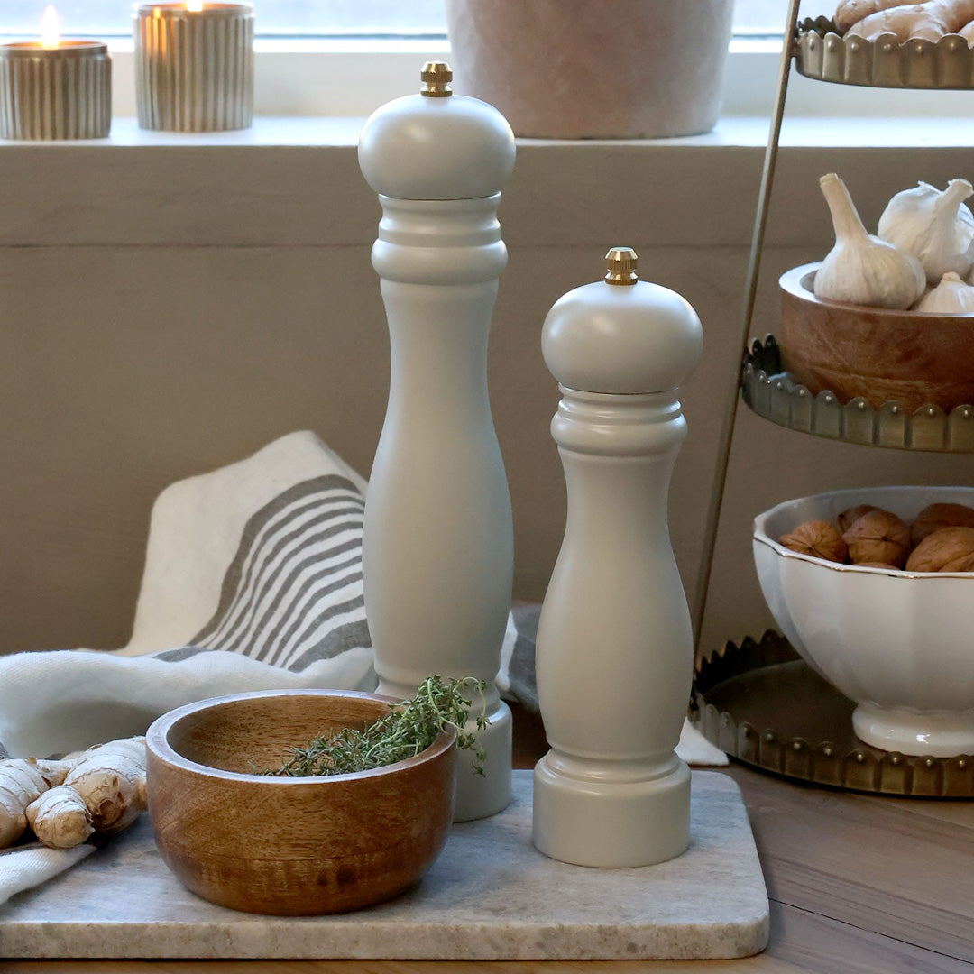 Verleihen Sie Ihrer Küche einen Hauch klassischer Eleganz mit dieser Salz- und Pfeffermühle von Chic Antique in der schönen, neutralen Lattefarbe.