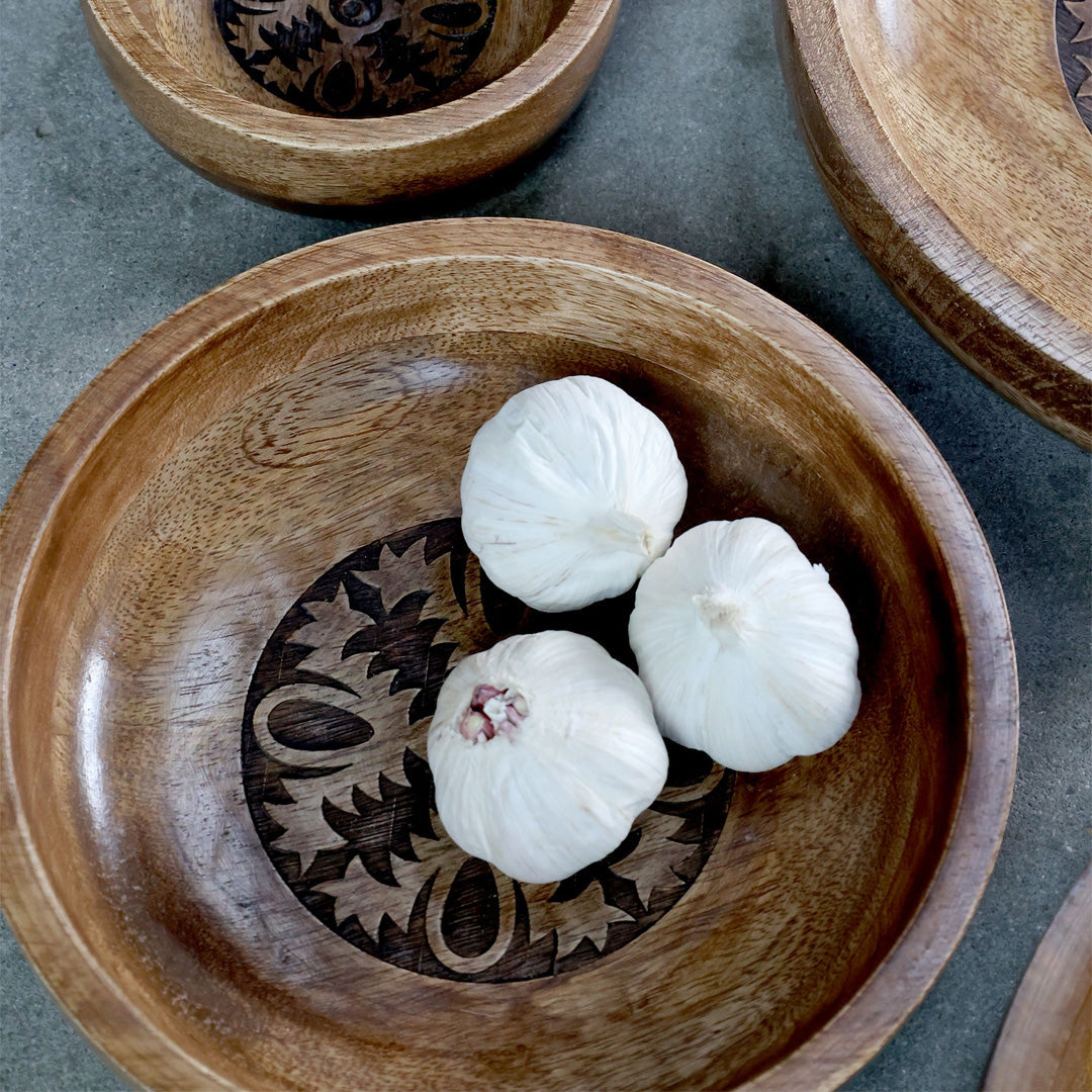 Gefertigt aus massivem Mangoholz und verziert mit einem kunstvoll geschnitzten Muster, besticht sie durch ihre natürliche Schönheit und handwerkliche Qualität.