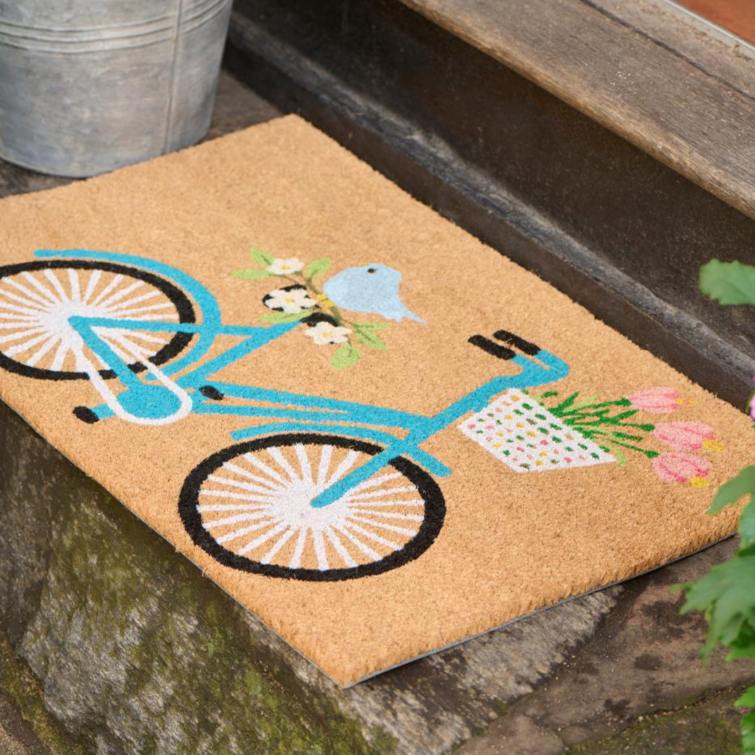 Begrüßen Sie Ihre Gäste mit dieser dekorativen Fußmatte mit Fahrradmotiv und Fahrradkorb. Die Matte besteht aus Kokosfasern mit PVC-Rückseite und verleiht dem Eingangsbereich einen charmanten und einladenden Ausdruck.