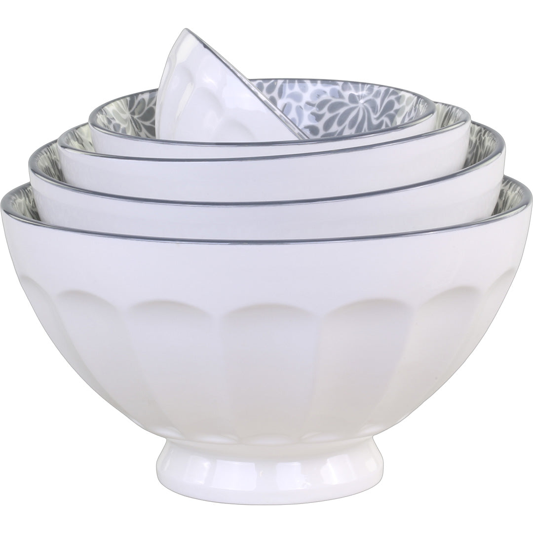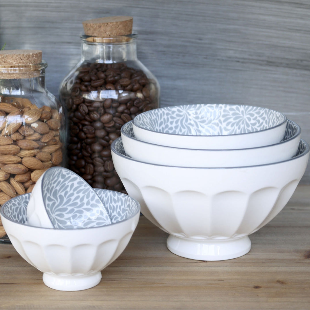 Die Schalen bestehen aus glasiertem Porzellan mit einer klassischen, gerillten Außenseite und einem wunderschönen Blattmuster in französischem Grau auf der Innenseite – eine perfekte Kombination aus moderner nordischer Schlichtheit und französischem Landhauscharme.