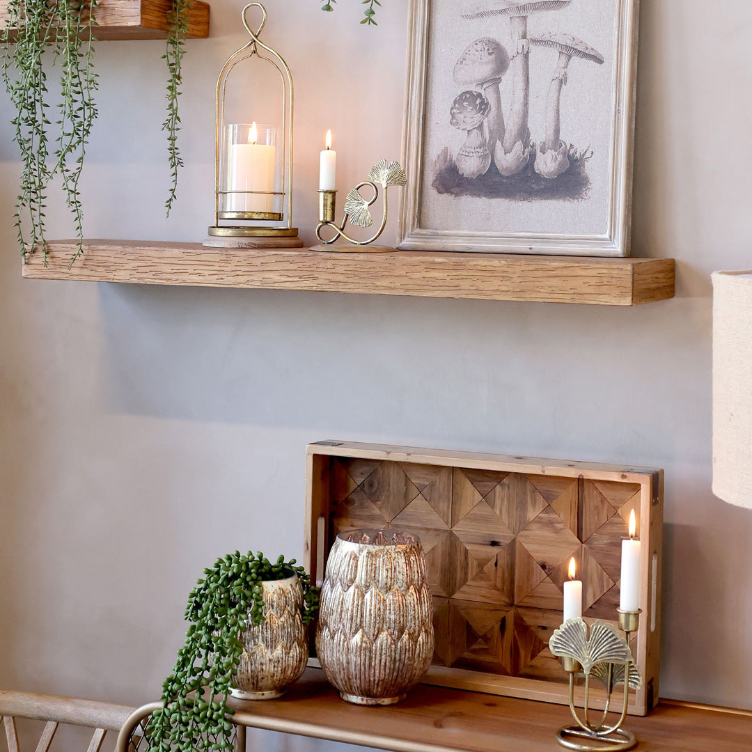 Mit seinem klaren Design und der warmen Holzstruktur ist es ideal, um Ihre Lieblingsdekorationen, Kerzenhalter, Pflanzen oder Kunstdrucke geschmackvoll zu präsentieren.