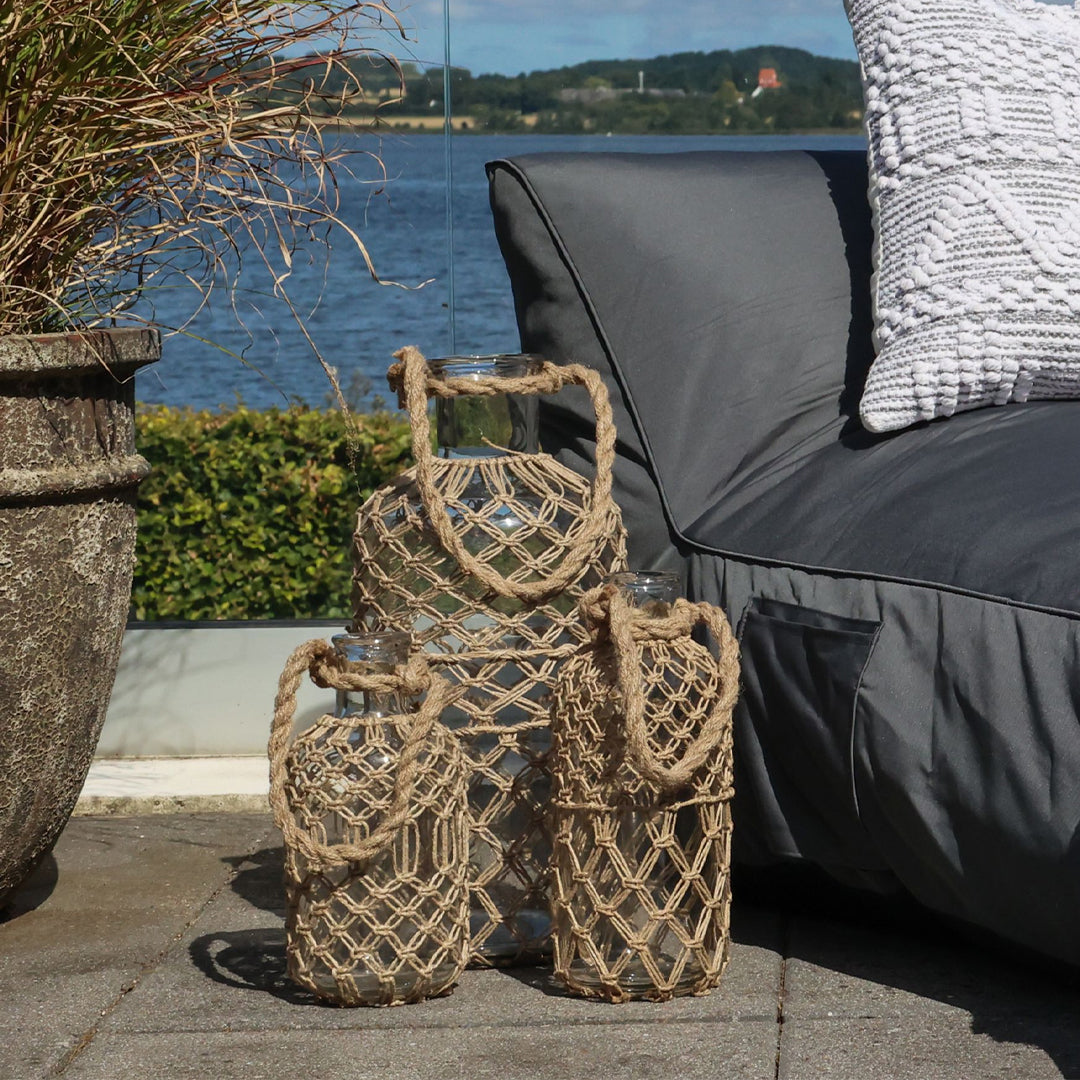 Dekorative Glasflasche mit Jutegeflecht und Henkel in schöner Naturfarbe. Dieses mittlere Modell kombiniert klares Glas mit rustikalem Naturgeflecht und schafft einen warmen, nordischen und leicht maritimen Ausdruck in der Einrichtung.