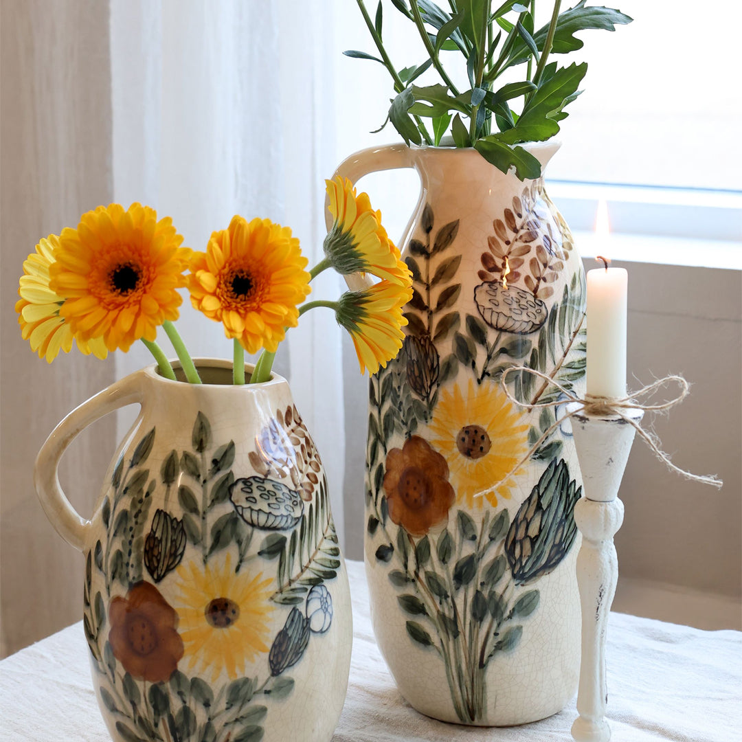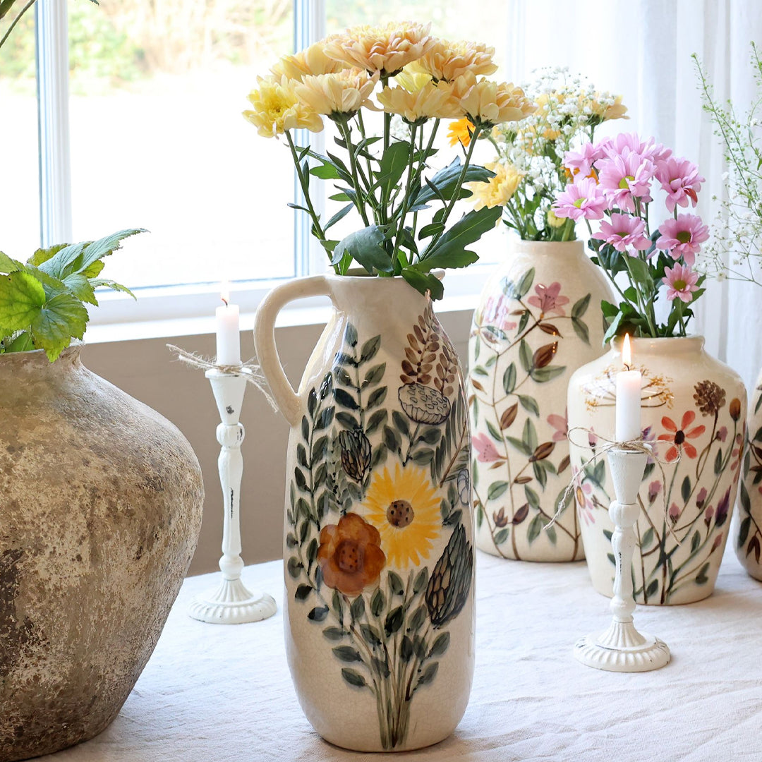 Die Kanne mit Blumenmotiv H36 / Ø16 cm in Creme ist eine dekorative und elegante Steingutkanne mit einem klassischen und zeitlosen Ausdruck. Das feine Blumenmotiv verleiht der Oberfläche Struktur und Tiefe, während die weiche cremefarbene Glasur für eine ruhige und harmonische Ausstrahlung in der Einrichtung sorgt.