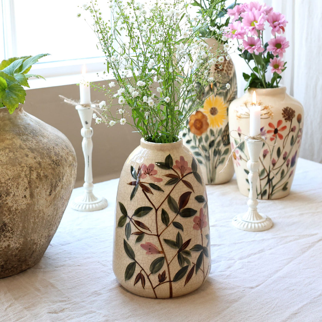 Die Vase mit Blumenmotiv H26 / Ø17 cm in Creme ist eine elegante und dekorative Steingutvase mit einem klassischen Ausdruck. Das feine Blumenmotiv verleiht Struktur und Tiefe, während die cremefarbene Oberfläche für eine ruhige und harmonische Ausstrahlung in der Einrichtung sorgt.