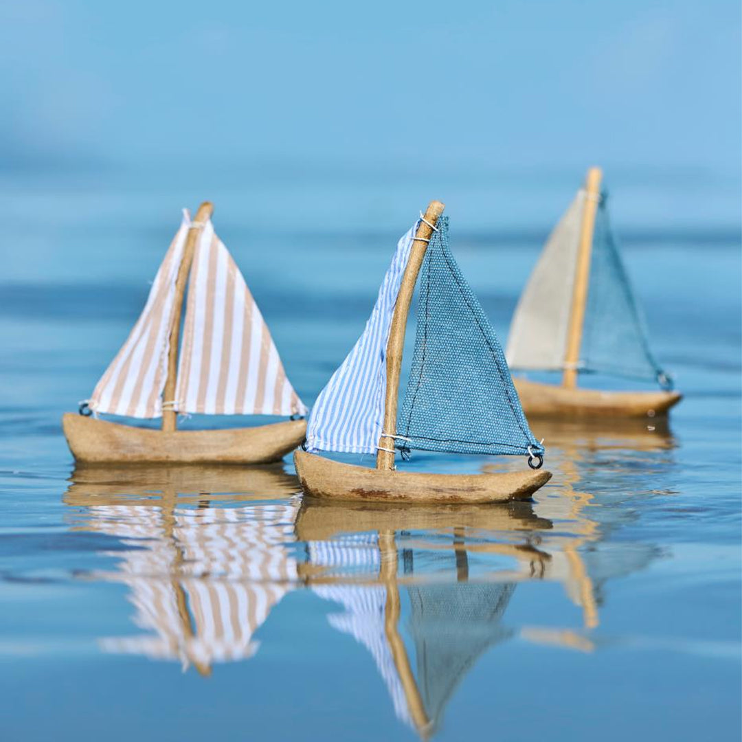 Ein Hauch von Meer für Ihre Einrichtung. Diese kleinen, handgefertigten Holzschiffe mit Doppelsegel schaffen eine gemütliche und authentische maritime Atmosphäre – perfekt für Wohnräume ebenso wie für das Ferienhaus. Die natürlichen Materialien verleihen jedem Schiff einen einzigartigen Charakter und bringen Wärme sowie Persönlichkeit in Ihre maritime Dekoration.