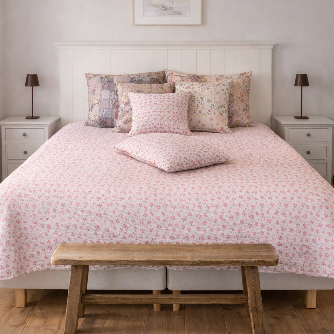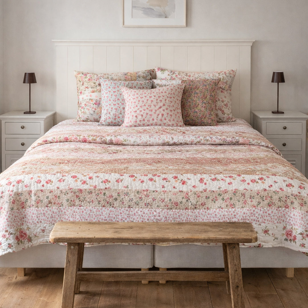 Mit ihren großzügigen Maßen von 240 × 240 cm ist sie ideal für Doppelbetten geeignet. Die wendbare Decke bietet zwei wunderschöne Seiten – auf der einen das detailreiche Patchwork-Design, auf der anderen ein feines, abgestimmtes Blumenmuster.