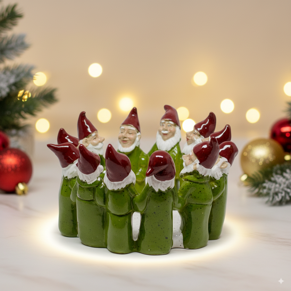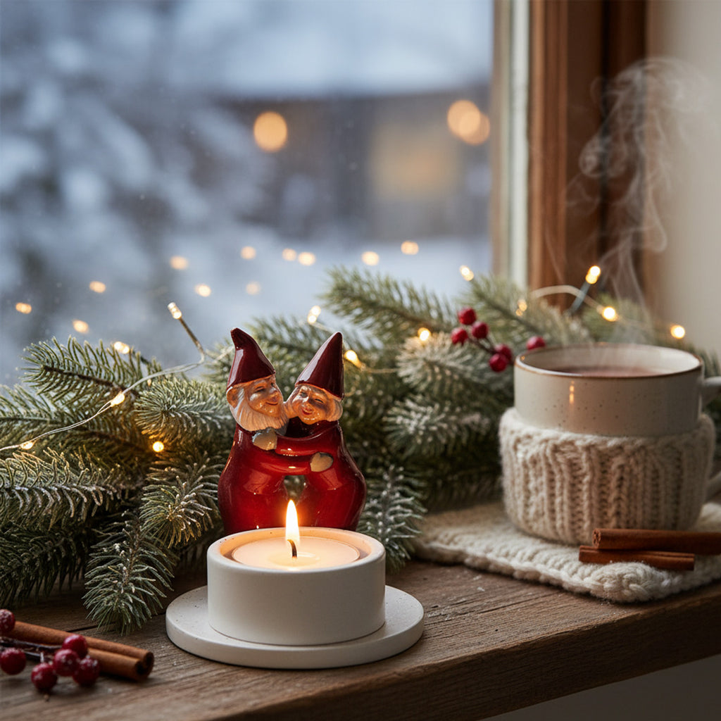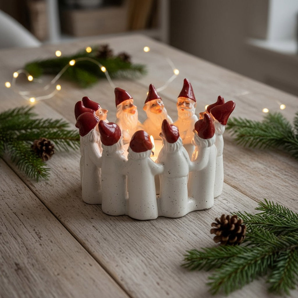 Verleihen Sie Ihrem Zuhause festlichen Glanz: Einfach ein Teelicht in die Mitte setzen – und schon verbreiten die fröhlichen Wichtel ein warmes Lächeln im ganzen Raum.