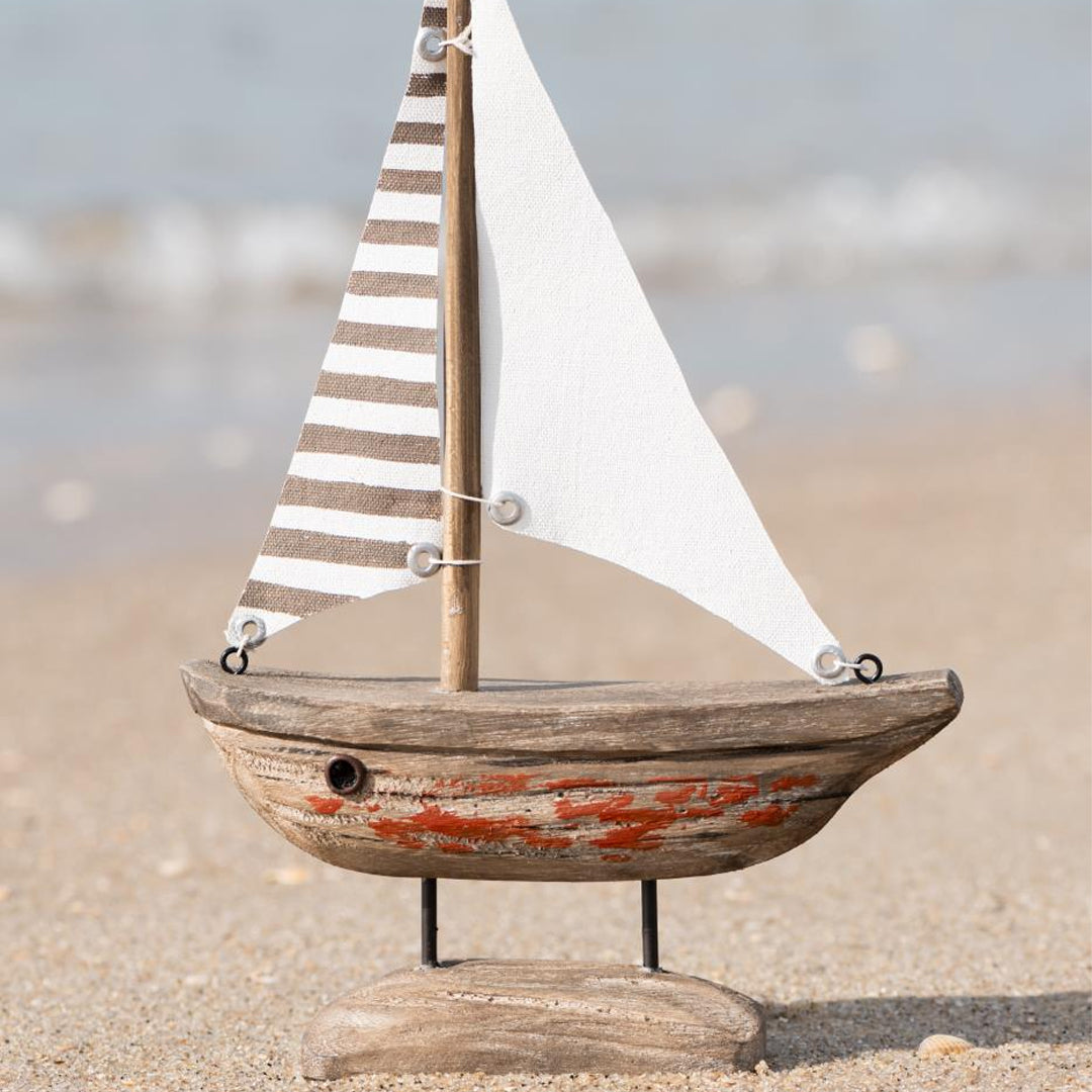 Bringen Sie das Küstenleben ins Zuhause mit diesem handgefertigten Holzschiff von Nautico. Das Schiff vereint einen rustikalen Look mit feinen maritimen Details wie dem weiß-gestreiften Segel und dem charakteristischen roten Rumpf. Ein stimmungsvolles Dekorationsobjekt, das an Meer, Strand und Sommer erinnert.