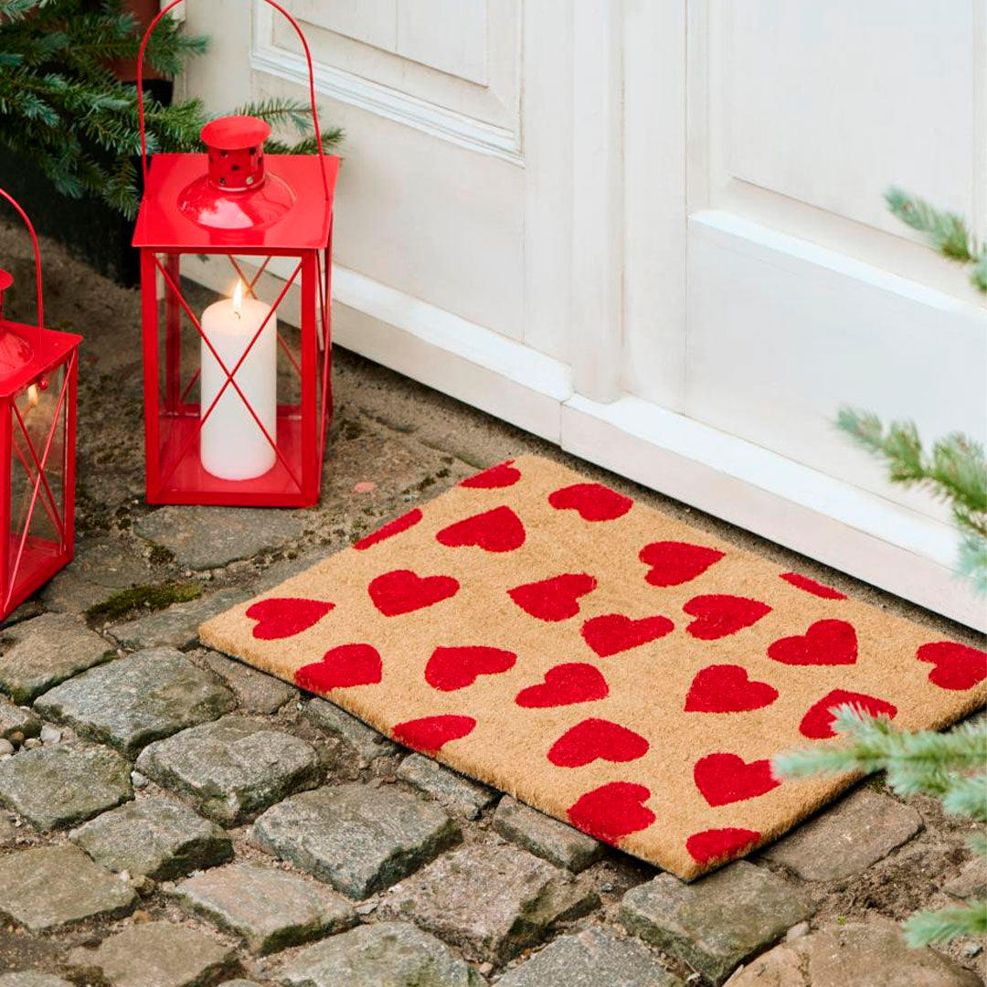 Begrüßen Sie Ihre Gäste mit dieser dekorativen Fußmatte, die rote Herzen zeigt. Die Matte besteht aus Kokos und PVC, was sie sowohl robust als auch dekorativ macht. Um Farben und Qualität zu erhalten, wird empfohlen, die Matte nicht direktem Sonnenlicht oder Regen auszusetzen.
