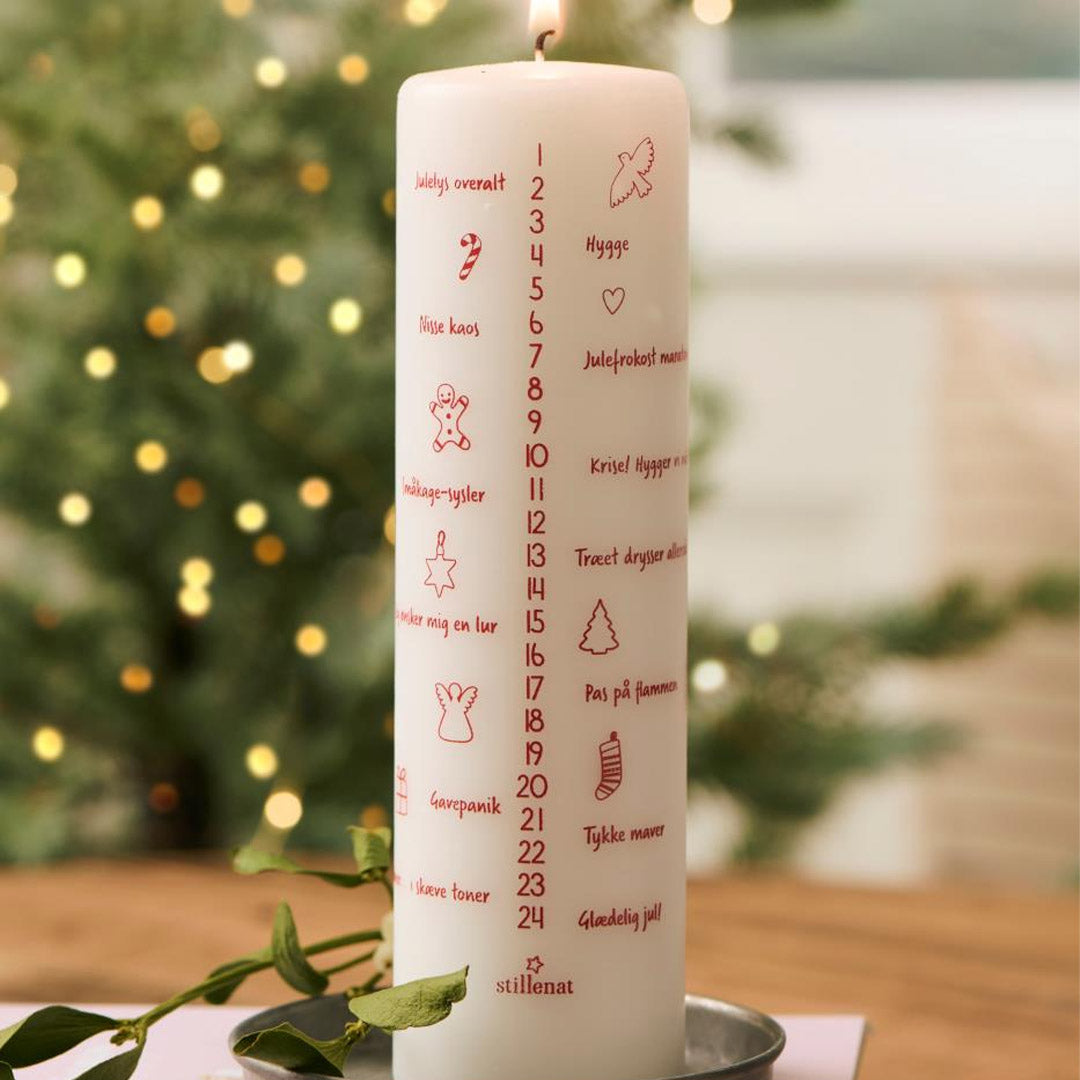 Kalenderkerze 1–24 – Weiß mit roten Zahlen und dänischem Text