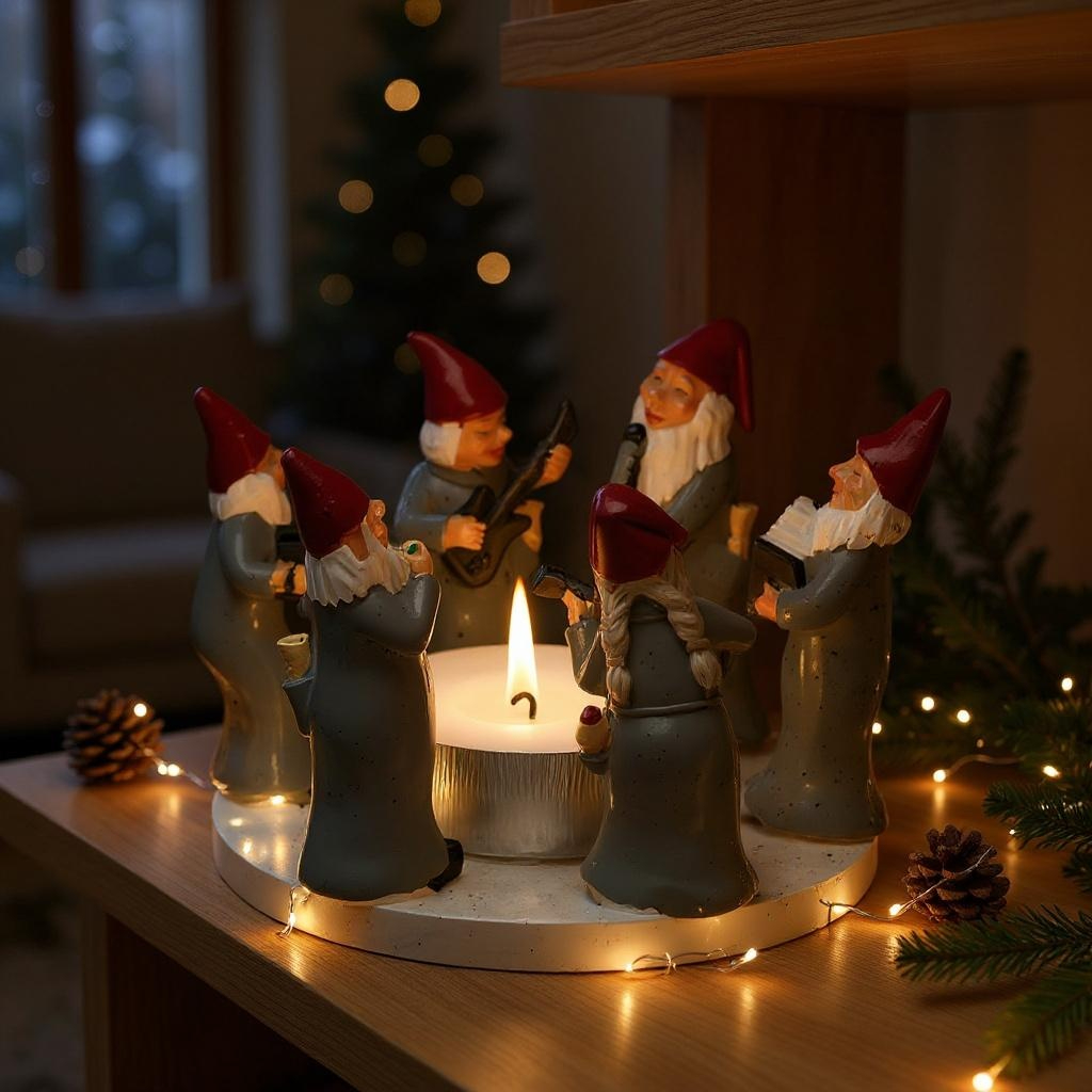Ein stimmungsvoller Hingucker für die Weihnachtszeit: Dieser graue Wichtelring von Harvesttime zeigt sechs musizierende Wichtel mit Instrumenten rund um ein zentrales Teelicht. Die Figuren sind detailreich gestaltet und bringen eine fröhliche Atmosphäre in Ihr Zuhause.
