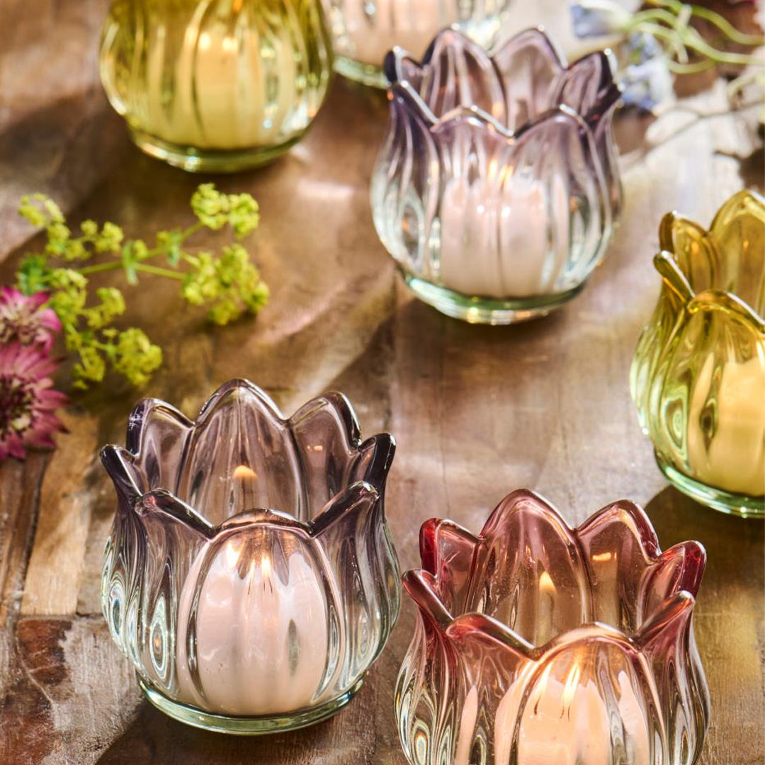 Schaffen Sie eine warme und gemütliche Atmosphäre mit diesen charmanten Tulpen-Teelichthaltern aus farbigem Glas. Die Kerzenhalter sind in Form von Tulpen gestaltet und besitzen einen eleganten, leicht verspielten Ausdruck, der ein schönes Lichtspiel erzeugt, wenn das Teelicht angezündet wird.