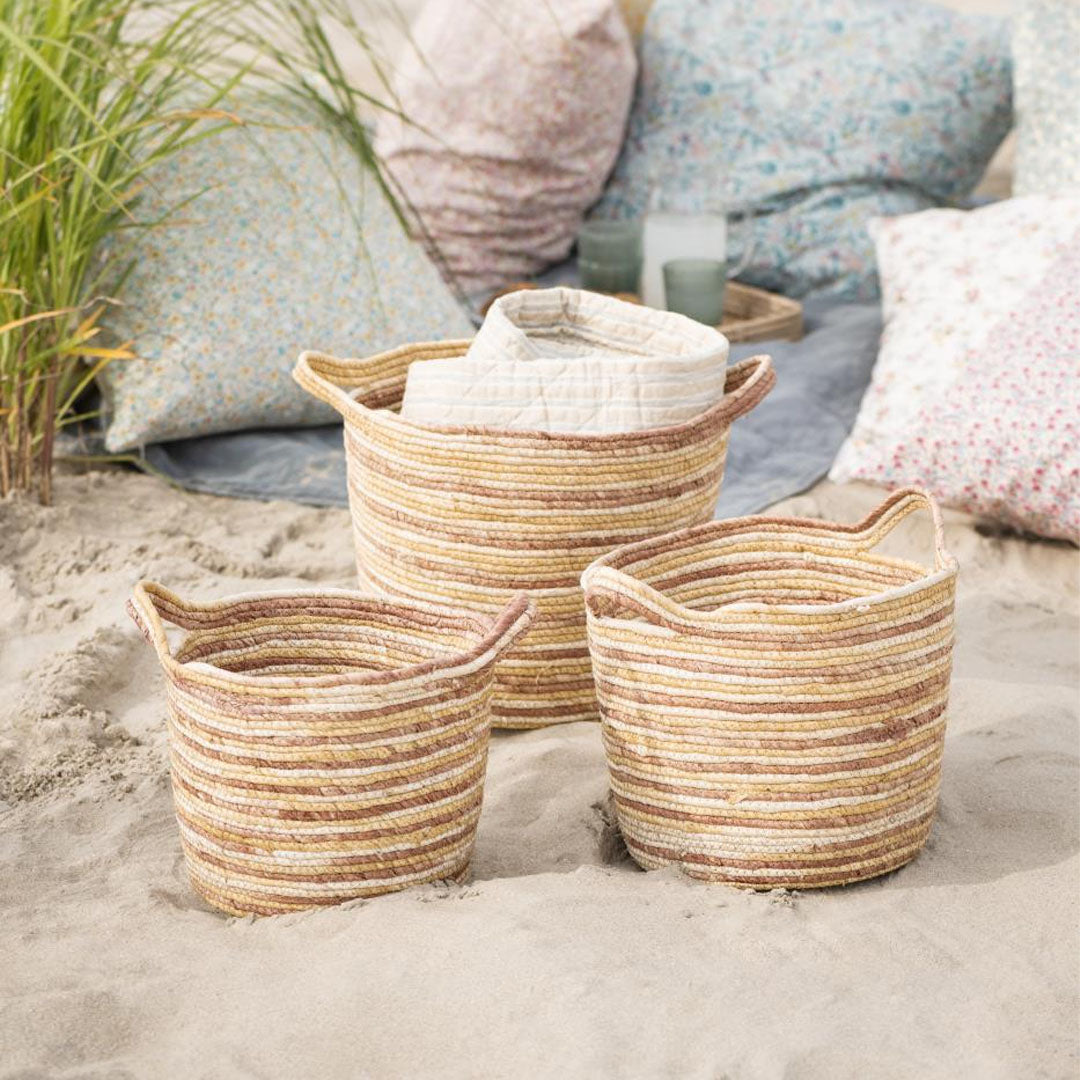 Bringen Sie Farbe und Funktionalität in Ihr Zuhause mit diesem handgefertigten Korb-Set aus natürlichem Maisstroh. Das Set besteht aus drei Körben in unterschiedlichen Größen mit praktischen Griffen und einem lebendigen Mix aus Natur, Rosa und Gelb – für einen frischen und verspielten Look.