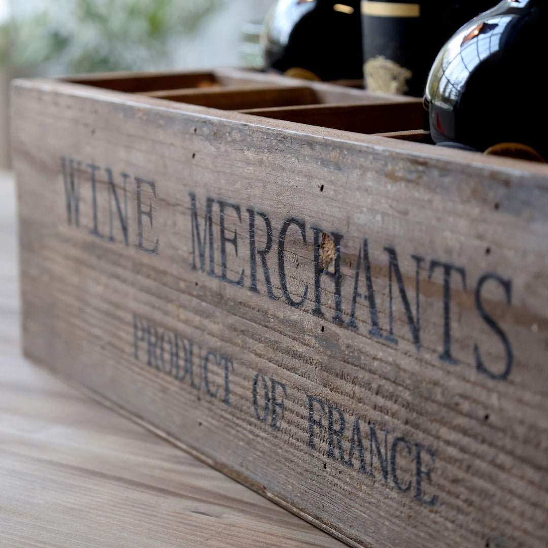 Diese dekorative Weinkiste mit 10 Fächern ist sowohl praktisch als auch stimmungsvoll. Die Kiste besteht aus Kiefernholz und Sperrholz mit einem rustikalen, patinierten Look und verfügt über einen Aufdruck an der Seite mit der Aufschrift „Wine Merchants – Product of France“, der ihr ein authentisches und klassisches Aussehen verleiht.