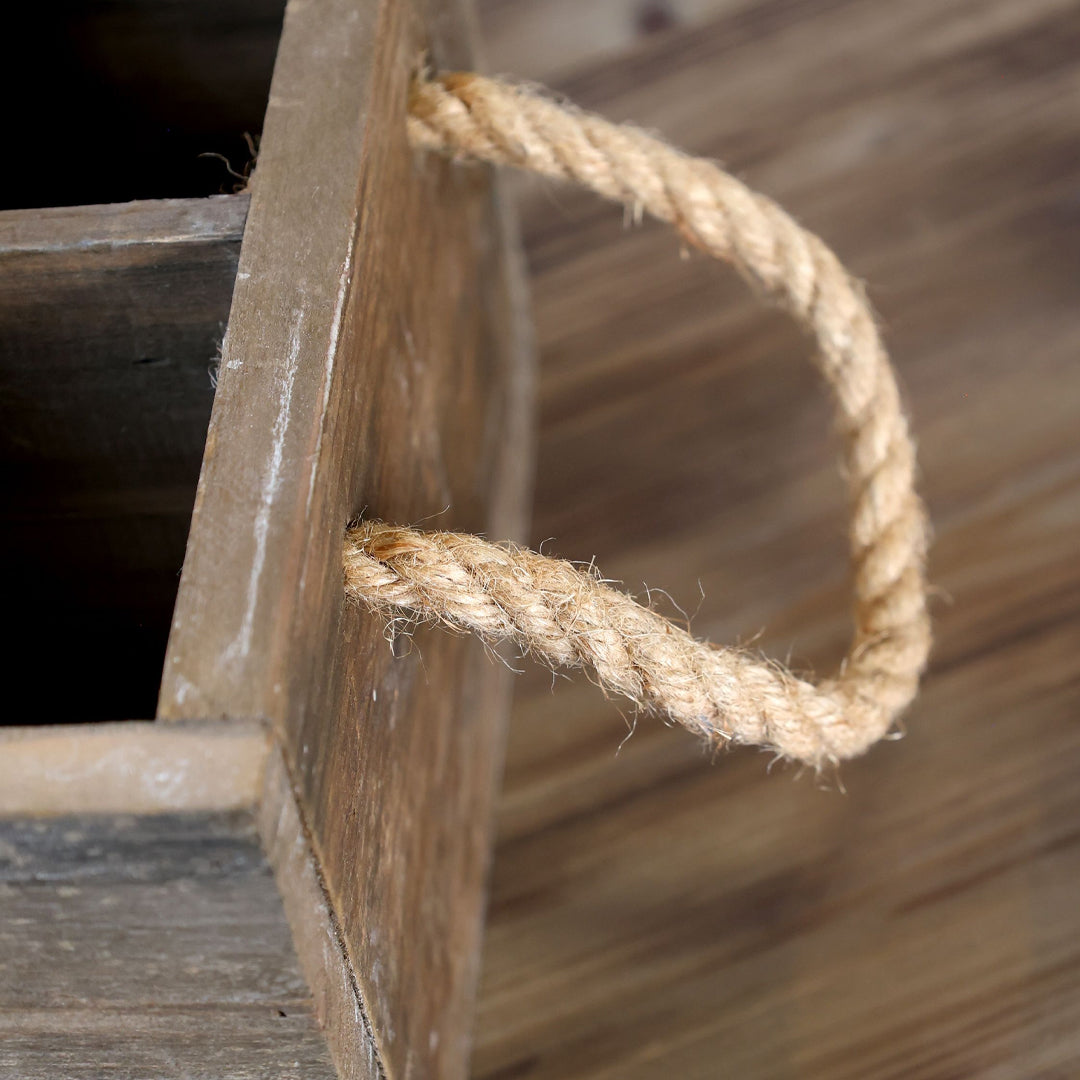 Die inneren Fächer machen die Kiste ideal zur Aufbewahrung von Weinflaschen, sie kann jedoch auch für andere Flaschen oder als dekoratives Aufbewahrungsstück in Küche, Esszimmer oder Weinkeller verwendet werden. Die Seilgriffe an den Seiten erleichtern das Tragen.