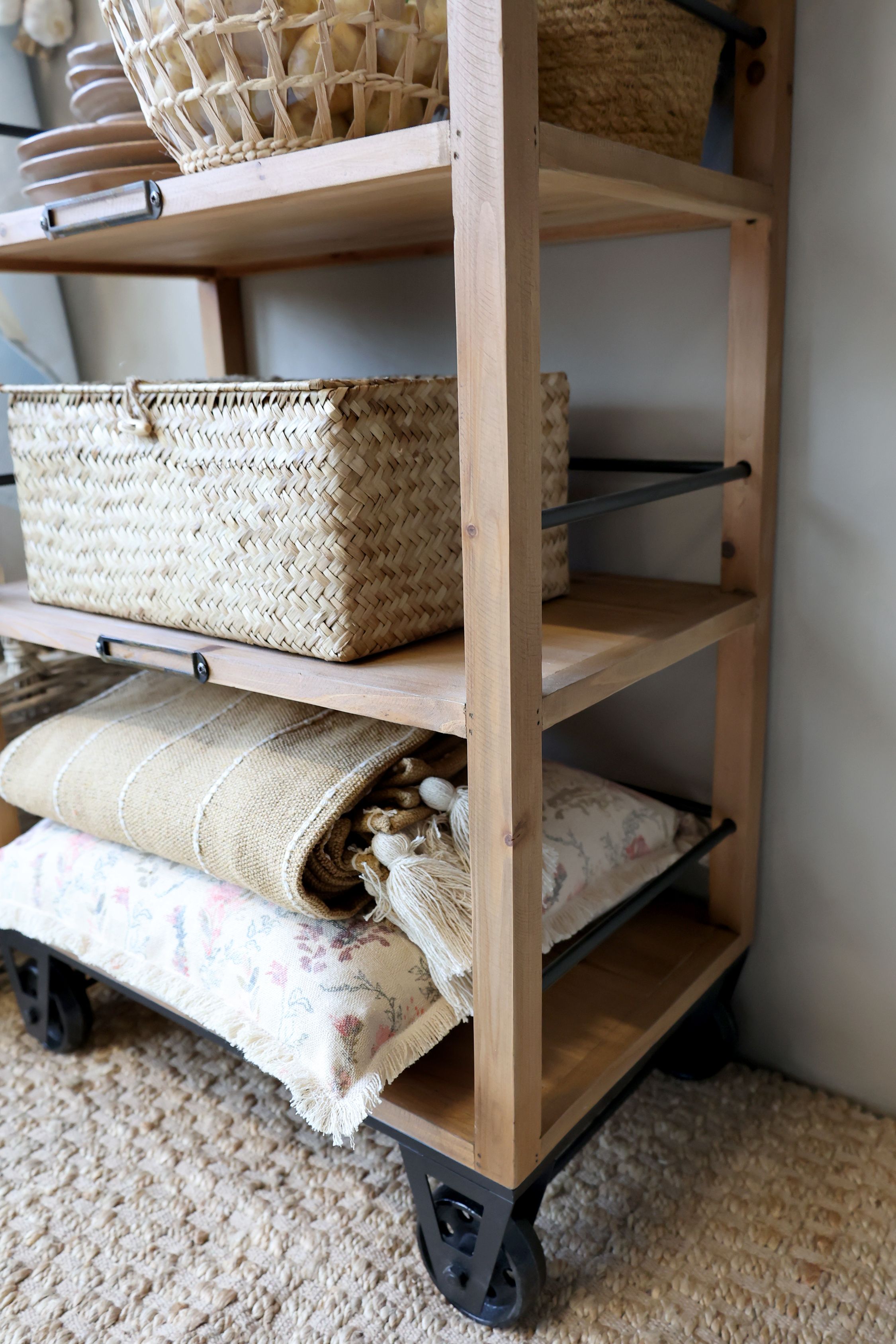 Die fünf geräumigen Ablagen bieten viel Platz für Dekorationen, Kochbücher, Pflanzen oder Küchenutensilien. Dank der stabilen Rollen lässt sich das Regal leicht bewegen und flexibel im Raum platzieren – perfekt für eine praktische und stilvolle Aufbewahrung.