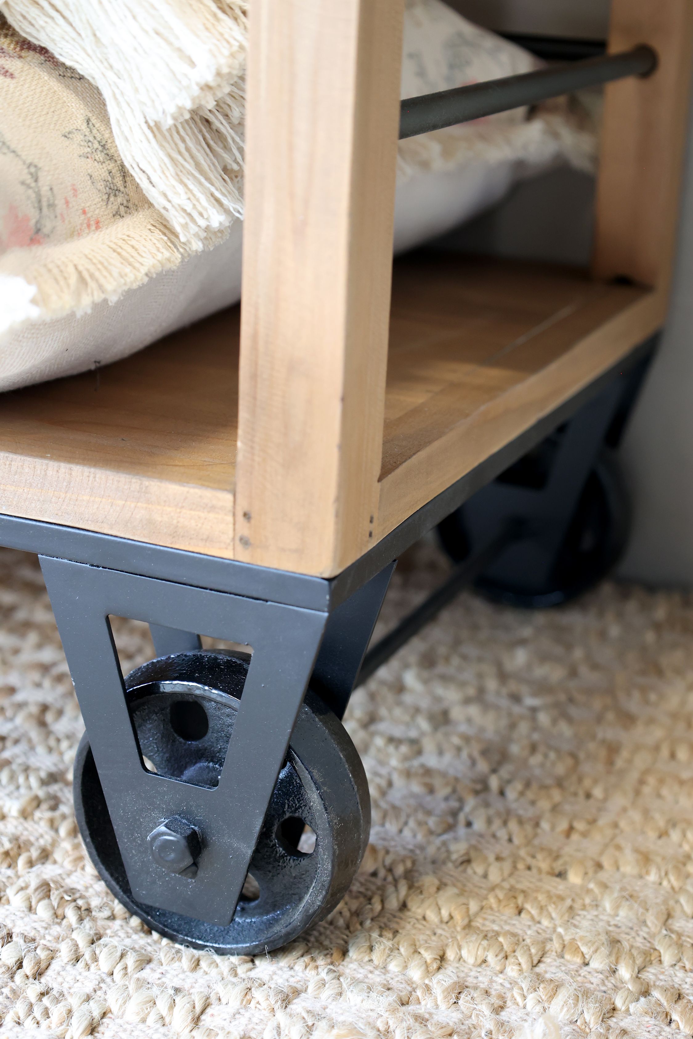Verleihen Sie Ihrem Zuhause sowohl Funktionalität als auch Charme mit diesem schönen Regal auf Rollen von Chic Antique. Gefertigt aus robustem Tannenholz und Eisen, bietet das Regal einen rustikalen und natürlichen Look, der perfekt sowohl in moderne als auch in klassische Einrichtungen passt.