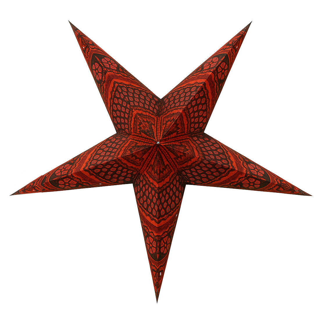 Lassen Sie das Licht erstrahlen mit dem Moonmind Surya Papierstern – einer handgefertigten, fünfzackigen Lampe mit kunstvollem Muster in tiefem Rot und elegantem Schwarz.