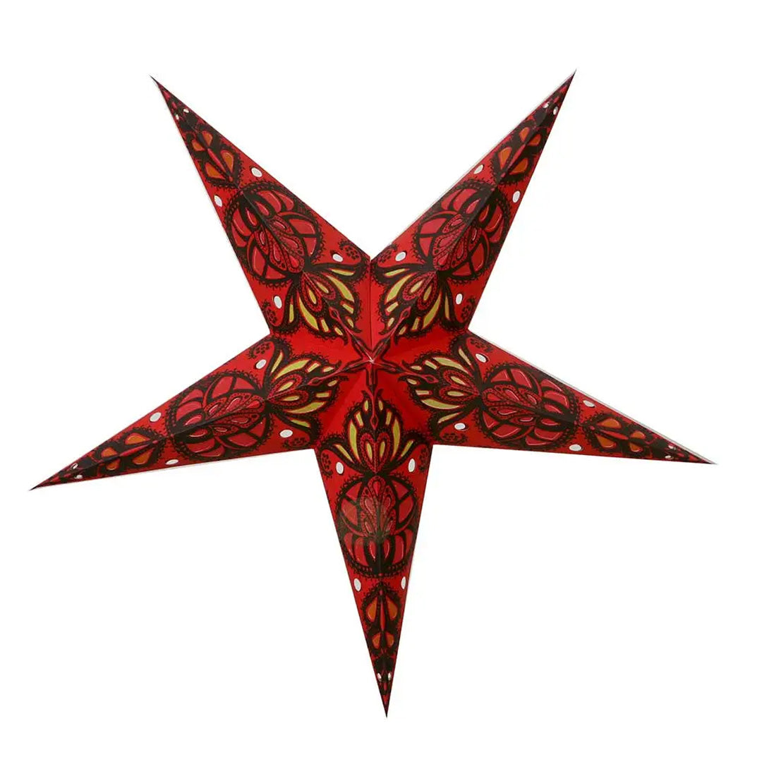 Schaffen Sie eine warme und stimmungsvolle Atmosphäre mit dem Moonmind Agni Papierstern – einer handgefertigten, fünfzackigen Lampe in tiefen Rot- und Goldtönen, inspiriert vom indischen Lichterfest Diwali.