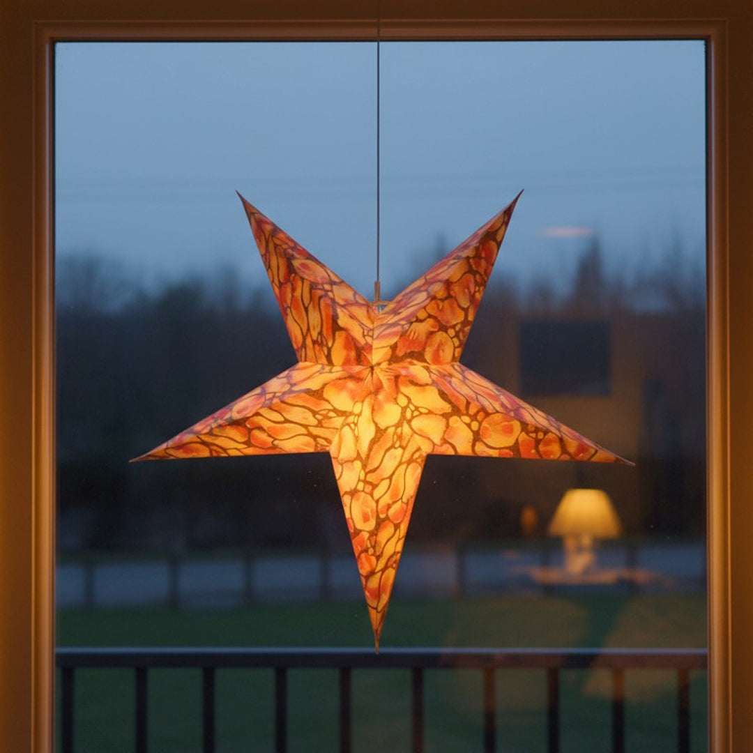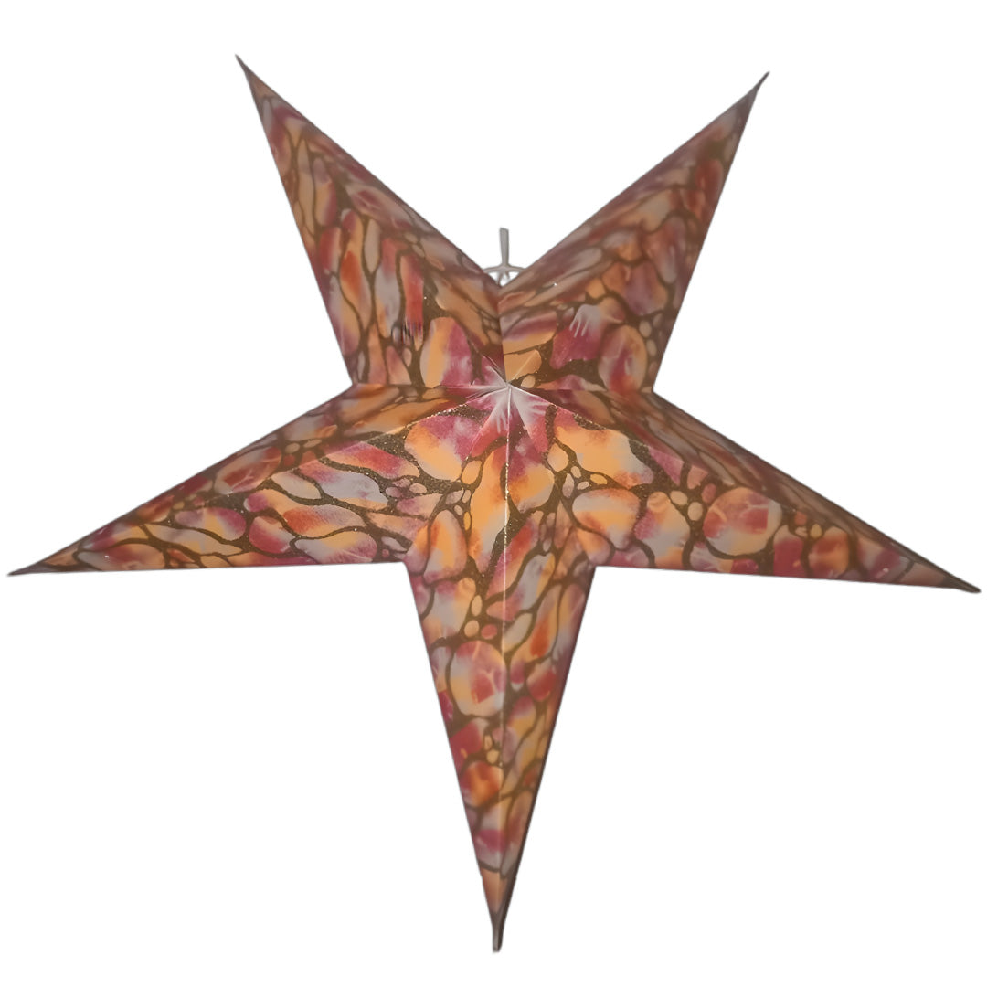 Erleben Sie ein warmes und kunstvolles Licht mit dem Moonmind Leela Papierstern – einer handgefertigten, fünfzackigen Lampe mit wunderschönem marmoriertem Muster in goldenen, rosafarbenen und braunen Tönen.