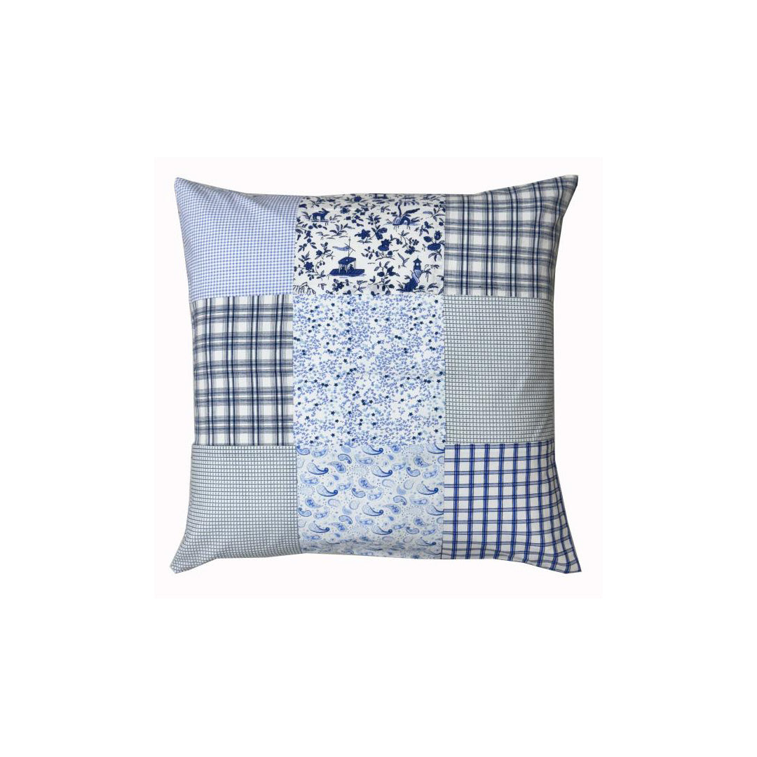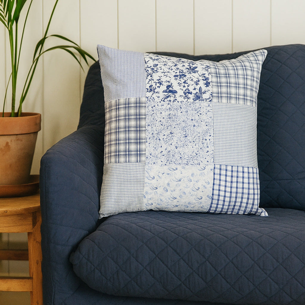 Moonmind Patchwork-Kissenbezug in Blau- und Weißtönen.