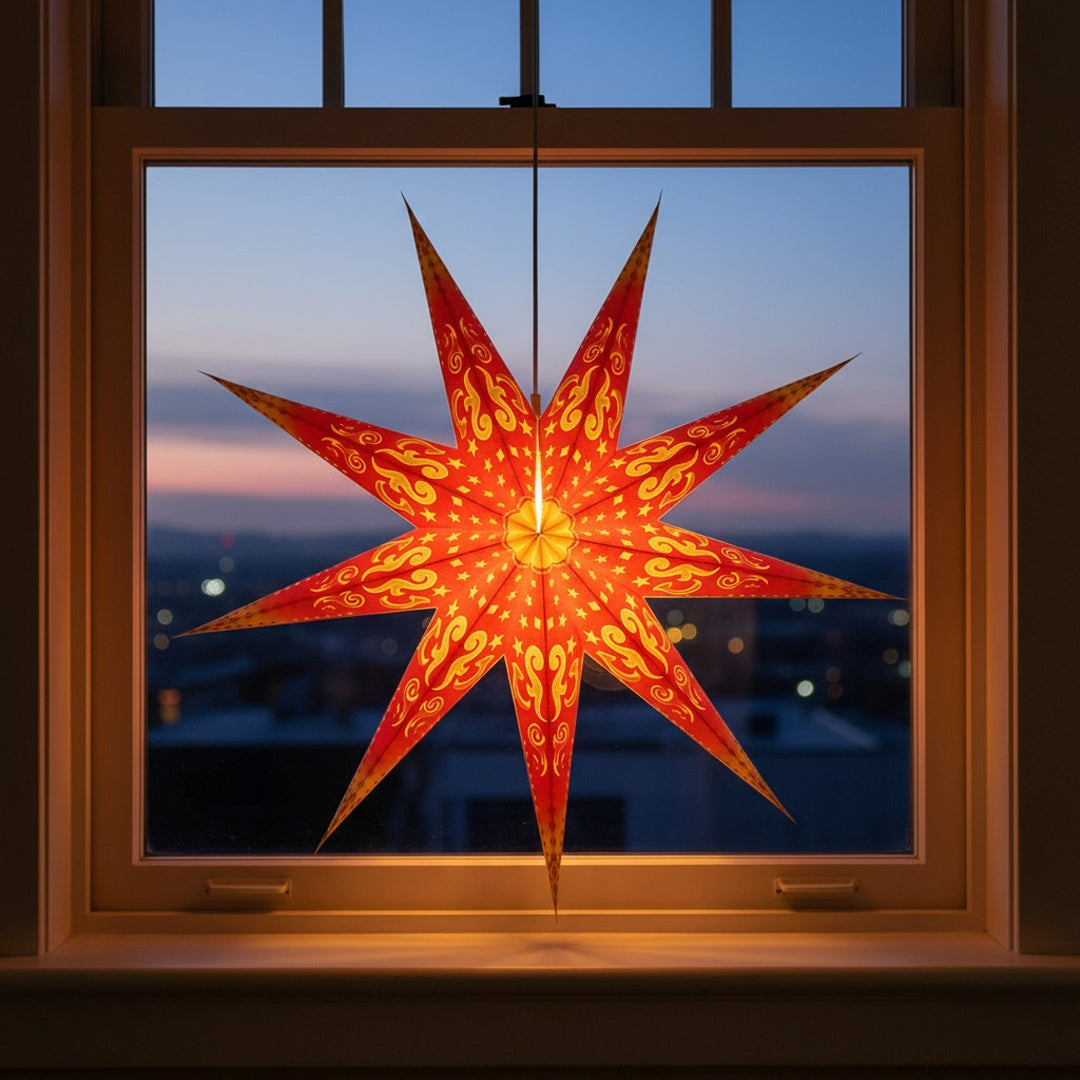 Lassen Sie das Licht erstrahlen mit dem Moonmind Surya Gold Papierstern – einer handgefertigten, neunzackigen Lampe in tiefen Rot- und Goldtönen.