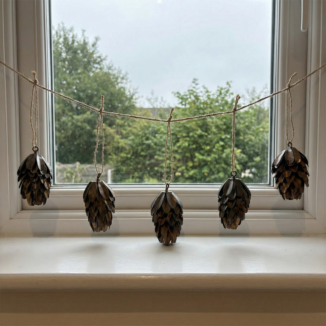 Verleihen Sie Ihrer Weihnachtsdekoration einen natürlichen und stimmungsvollen Ausdruck mit dieser dekorativen Girlande von Moonmind. Die Girlande besteht aus fünf identischen Zapfen aus lackiertem Metall, die mit feinen Details gestaltet sind und einen realistischen sowie eleganten Gesamteindruck vermitteln. Die dunkle, lackierte Oberfläche verleiht Wärme und Tiefe und macht die Ornamente perfekt für sowohl moderne als auch klassische Dekorationen. Ideal zum Aufhängen an einem Zweig, im Fenster oder als Teil eines dekorativen Weihnachtsarrangements.