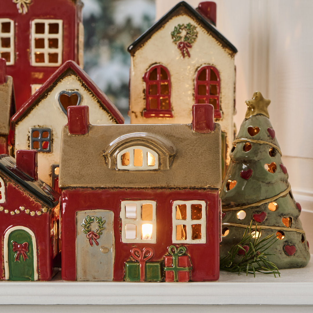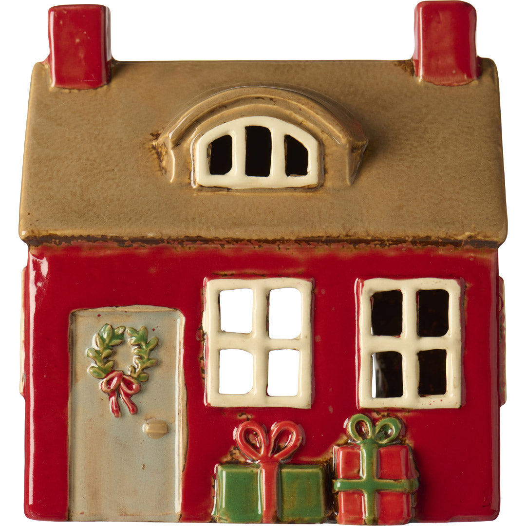Dieses schöne Haus für Teelichter, gefertigt aus Steinzeug, schafft eine magische Weihnachtsstimmung. Dank eines Türkranzes und der Geschenke an der Tür verleiht es jedem Raum eine gemütliche und festliche Note. Das Haus misst B: 8,5 cm, H: 14 cm, L: 13 cm und ist ideal, um in der dunklen Jahreszeit Wärme und Behaglichkeit zu verbreiten.