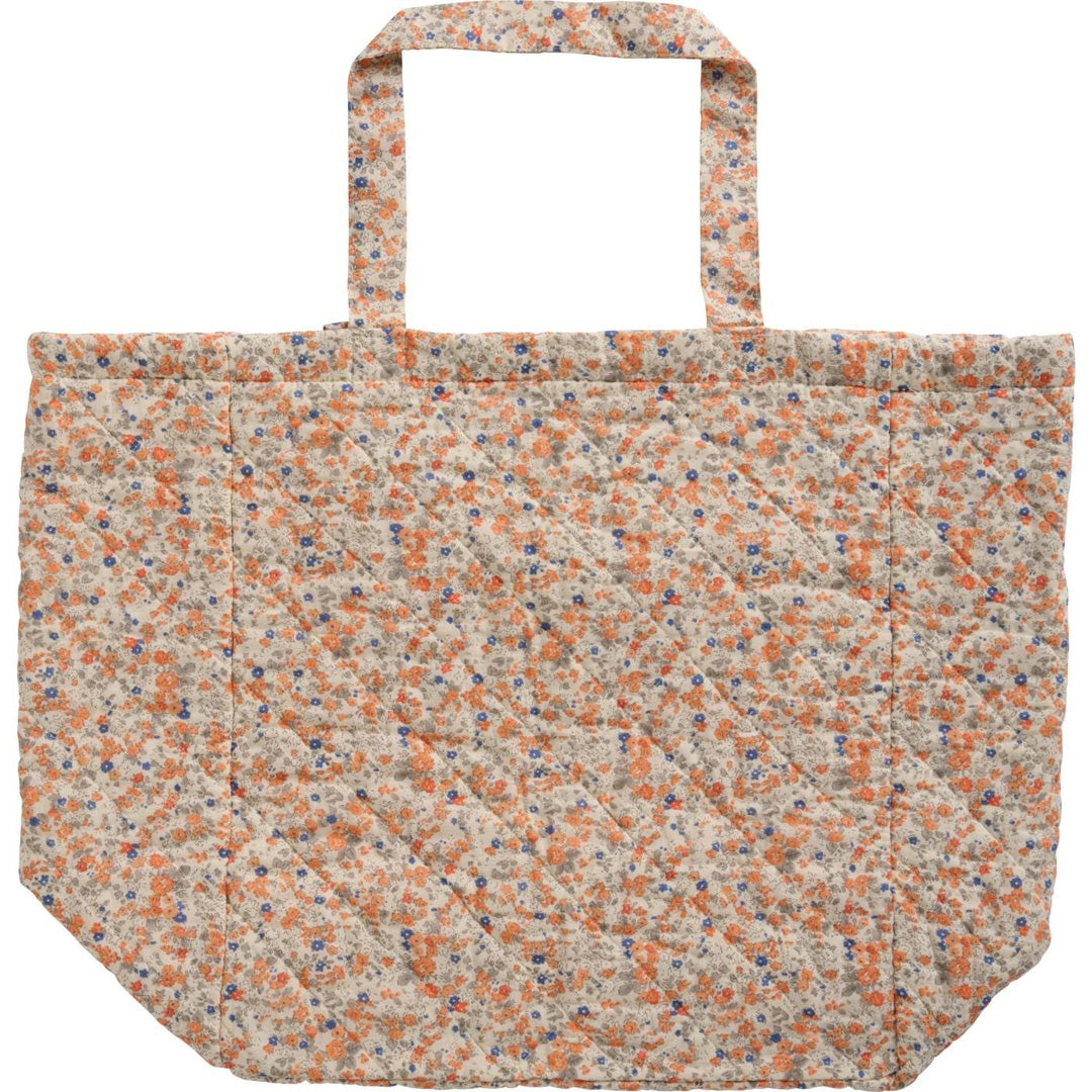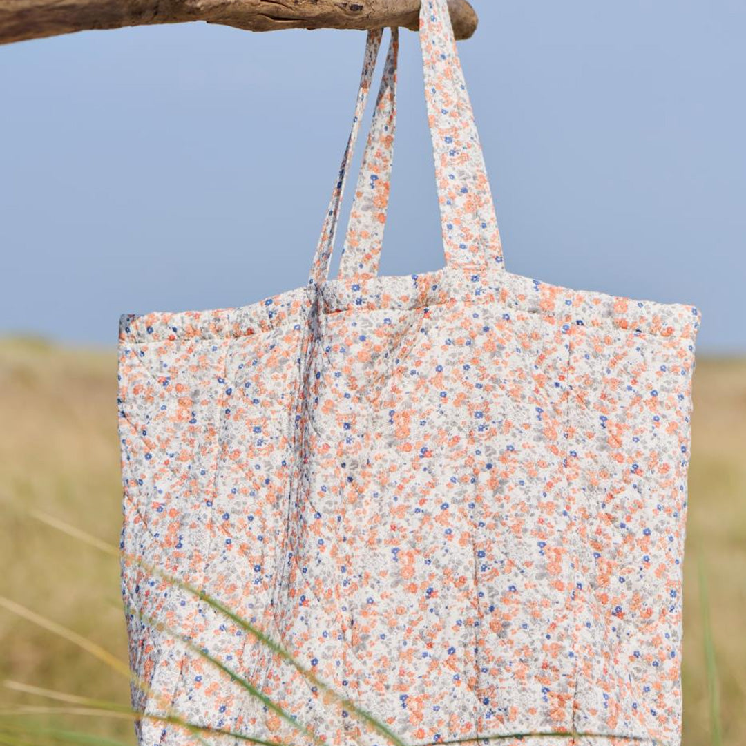 Diese gesteppte Baumwolltasche von Ib Laursen vereint stilvolles Design und praktischen Nutzen in einem. Das lebendige Blumenmuster in Orange und Blau auf hellem Hintergrund macht sie zu einem echten Hingucker. Die weiche Wattierung sorgt für angenehmen Tragekomfort und stabile Form. Ob für den Alltag, den Einkauf oder den Strand – diese Tasche ist der perfekte Begleiter.