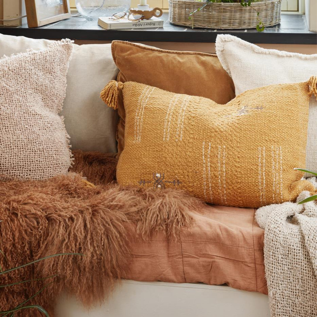 Tibetisches Lammfell von Ib Laursen in einer warmen und einladenden Cognac-Farbe, die dem Raum Tiefe und eine gemütliche, nordische Atmosphäre verleiht.