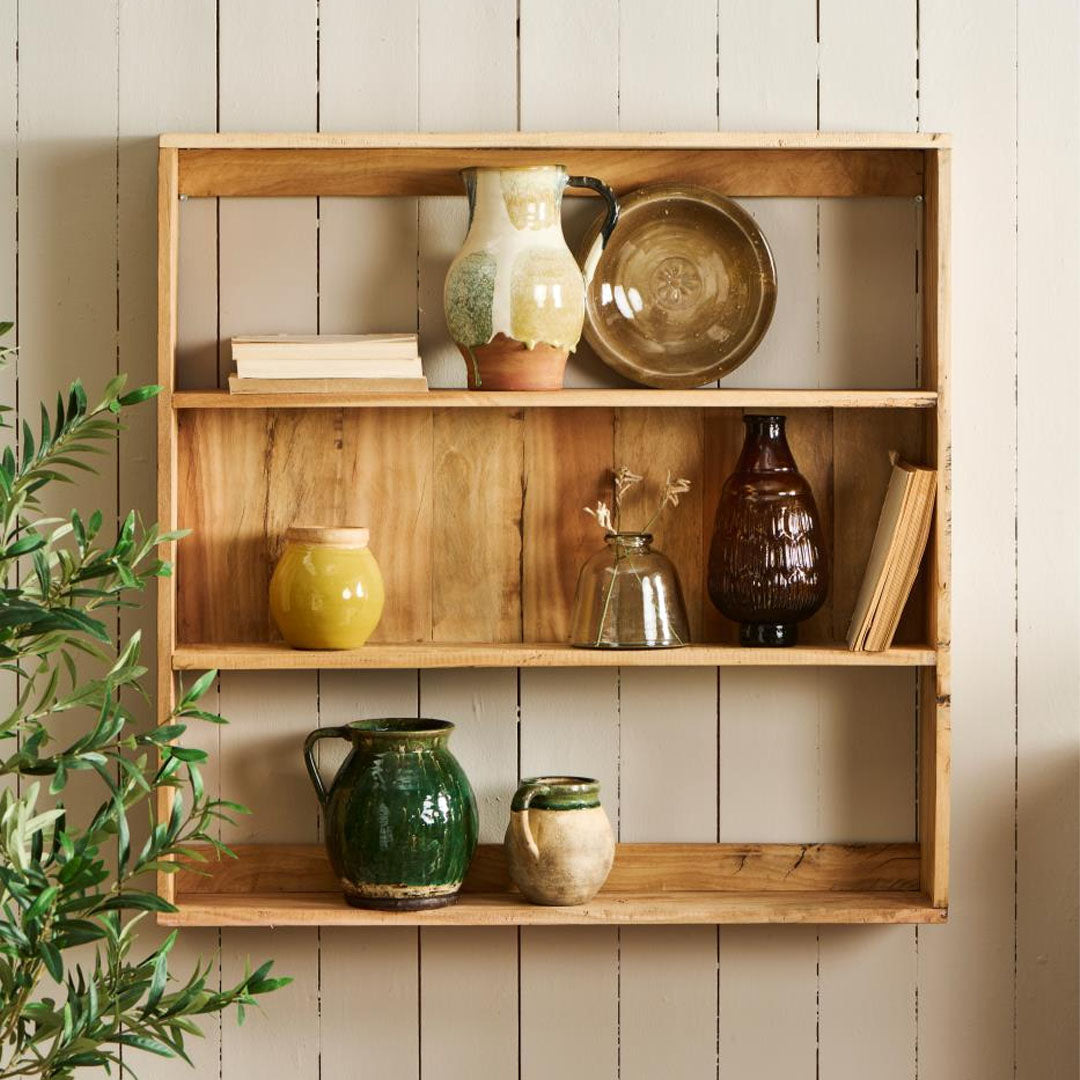 Dieses schöne Wandregal vereint Funktionalität mit Ästhetik und verleiht Ihrem Zuhause eine persönliche Note. Das Regal wird in Indien aus recyceltem Abbruchholz gefertigt, wodurch jedes Regalstück seinen eigenen Charakter mit natürlichen Variationen in Struktur und Farbe des Holzes erhält. Die teilweise Rückwand schafft einen dekorativen Rahmen, während die drei Ablagen ausreichend Platz für Bücher, Pflanzen oder andere Lieblingsgegenstände bieten.