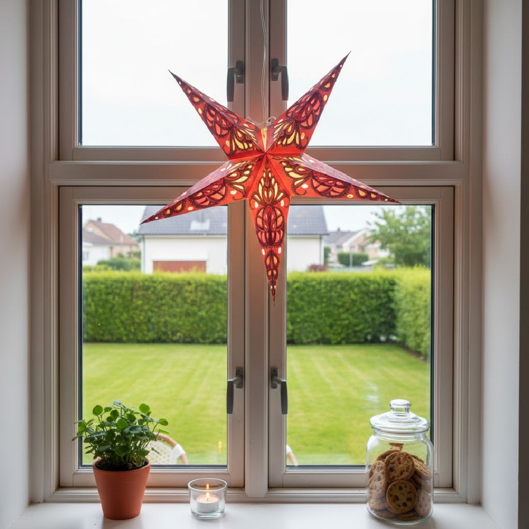 Schaffen Sie eine warme und stimmungsvolle Atmosphäre mit der Moonmind Agni Sternenlampe – einer handgefertigten 5-zackigen Papierlampe in tiefroten und goldenen Nuancen, inspiriert vom indischen Lichterfest Diwali. Sie lässt das Licht sanft durch das Papier scheinen und erzeugt einen magischen Ausdruck, ganz gleich, ob sie im Fenster, im Wohnzimmer oder im Kinderzimmer hängt.