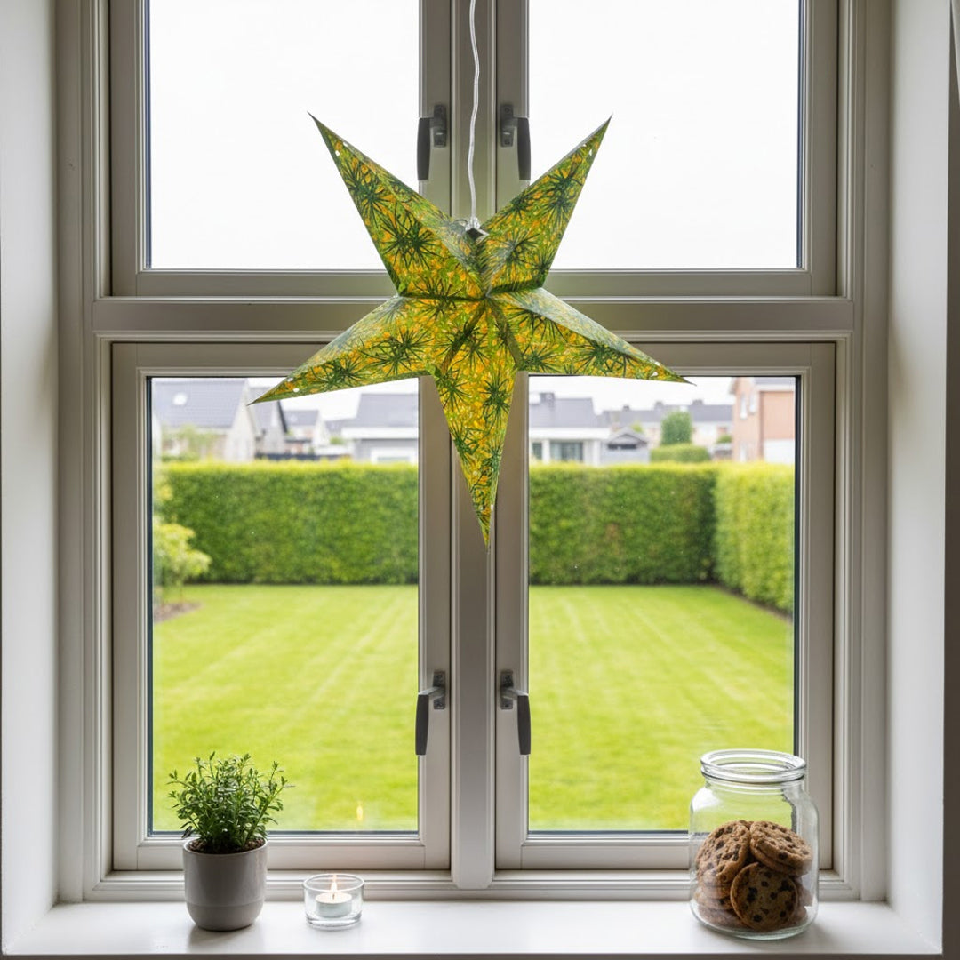Bringen Sie Farbe, Leben und die Energie der Natur in Ihr Zuhause mit der Moonmind Aranya Sternenlampe – einer handgefertigten 5-zackigen Papierlampe in grünen und gelben Nuancen mit einem üppigen, fast botanischen Muster. Sobald die Lampe eingeschaltet ist, treten die Farben wunderschön hervor und werfen ein warmes, lebendiges Licht in den Raum.