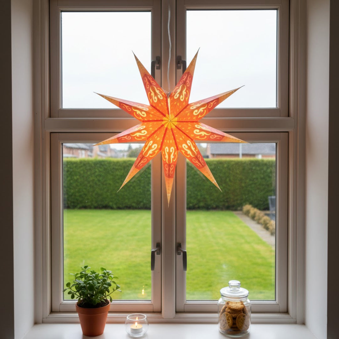 Lassen Sie das Licht strahlen mit der Moonmind Surya Gold Sternenlampe – einer handgefertigten 9-zackigen Papierlampe in tiefroten und goldenen Nuancen. Die feinen Sternendetails und geschwungenen Muster schaffen einen festlichen und eleganten Ausdruck, der an die Wärme und das Licht der Weihnachtszeit erinnert.
