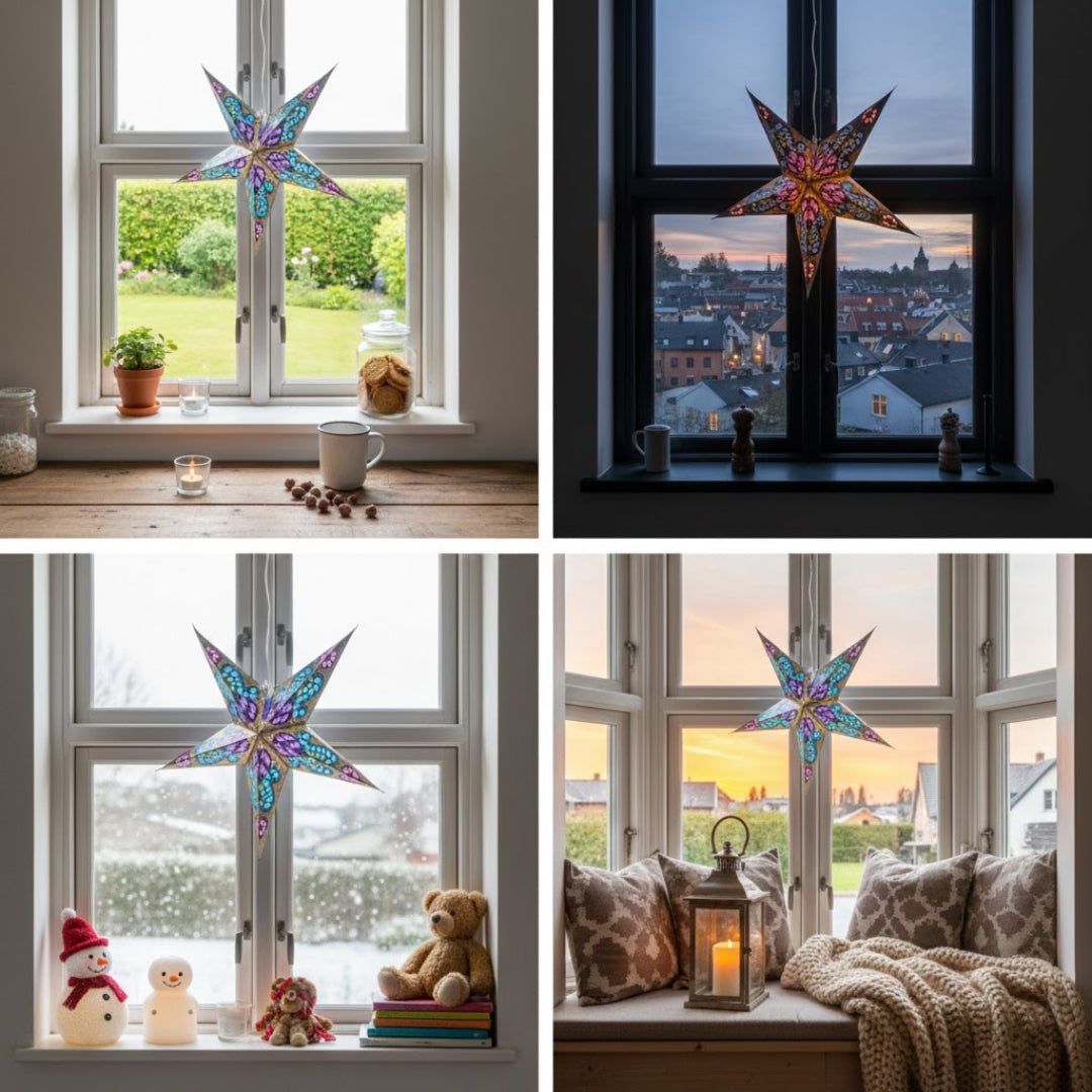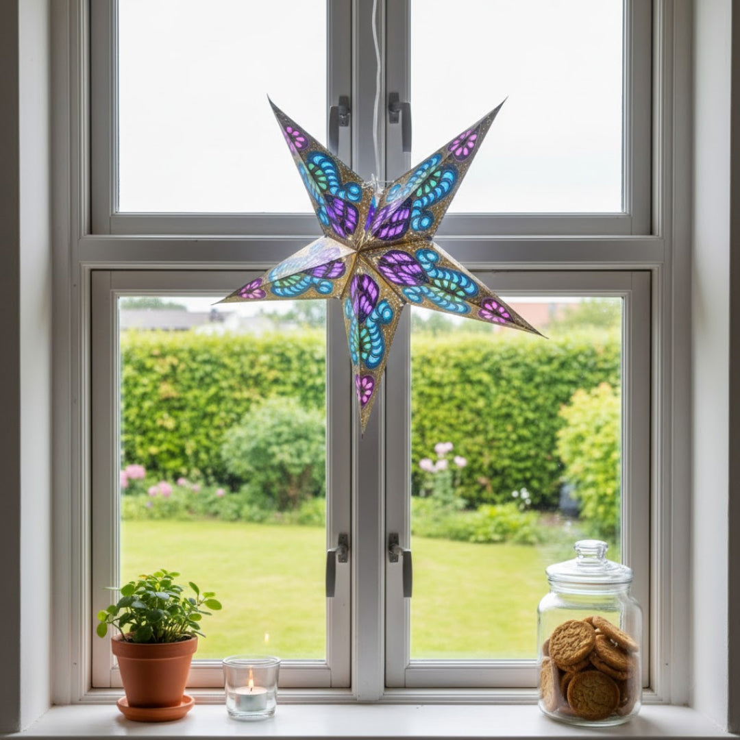 Lassen Sie das Licht sich entfalten mit der Moonmind Tara Sternenlampe – einer handgefertigten 5-zackigen Papierlampe, die tiefe Blau-, Türkis- und Lilatöne auf dunklem Hintergrund kombiniert. Das Ergebnis ist ein elegantes, fast kosmisches Farbenspiel, das einen ruhigen und stimmungsvollen Lichtschein in den Raum wirft.