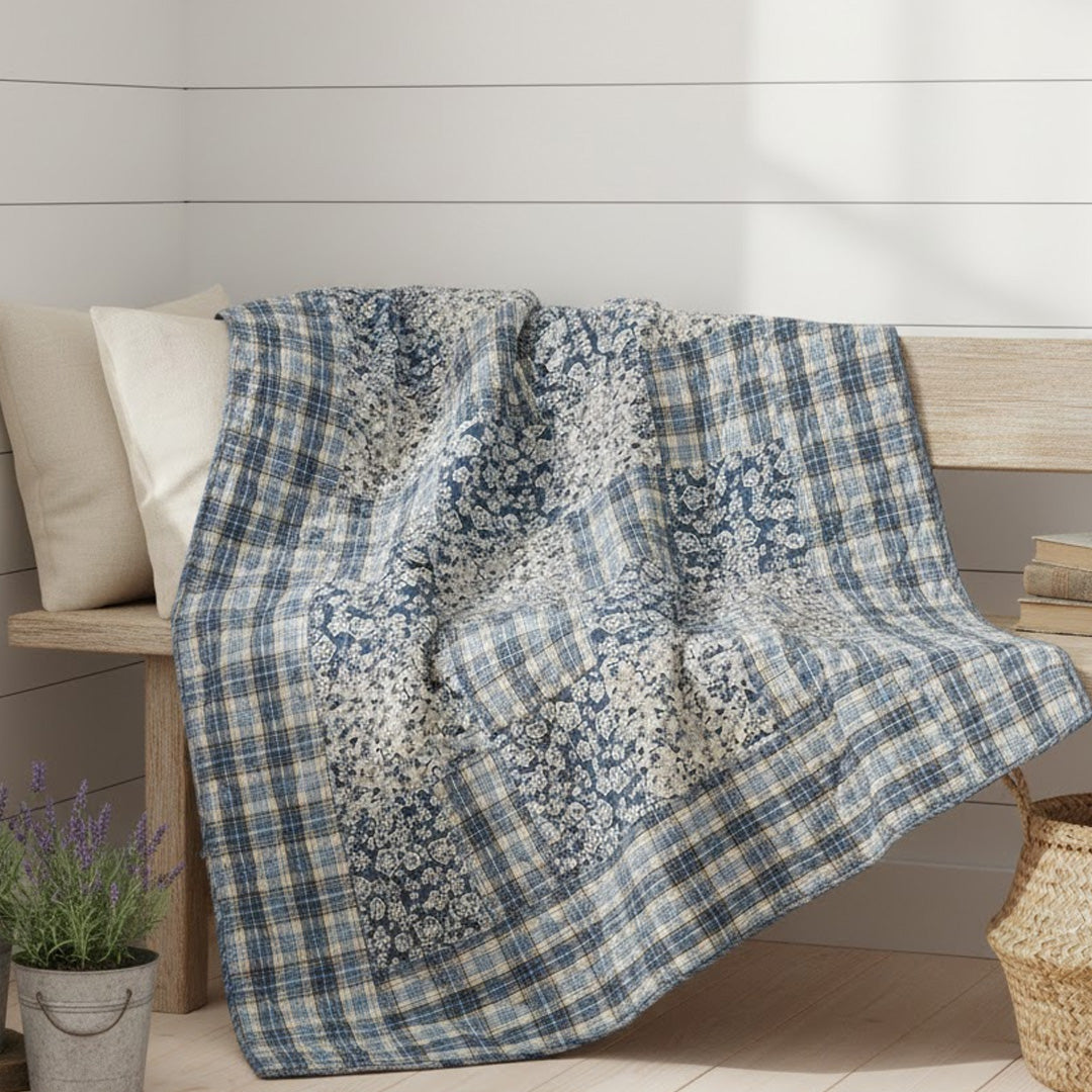 Das klassische Patchworkmuster kombiniert florale Prints und Karostoffe in harmonischen Blautönen – von hell bis tief dunkelblau. Jede Decke ist wendbar und zeigt auf der Rückseite ein abgestimmtes Muster – zwei Looks in einem Produkt.