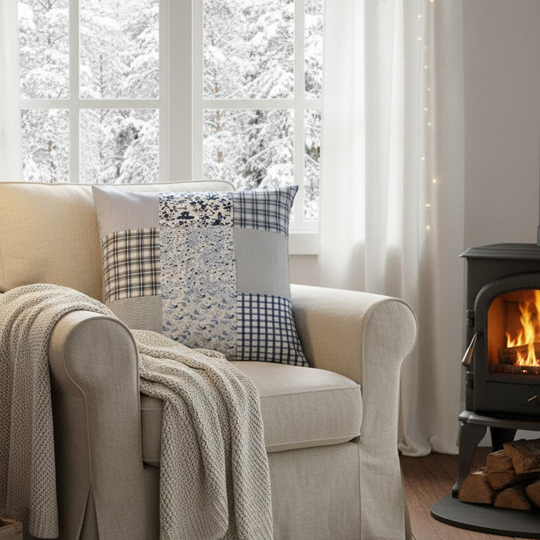 Handgequilteter Patchwork-Kissenbezug in Blau, 50x50 cm