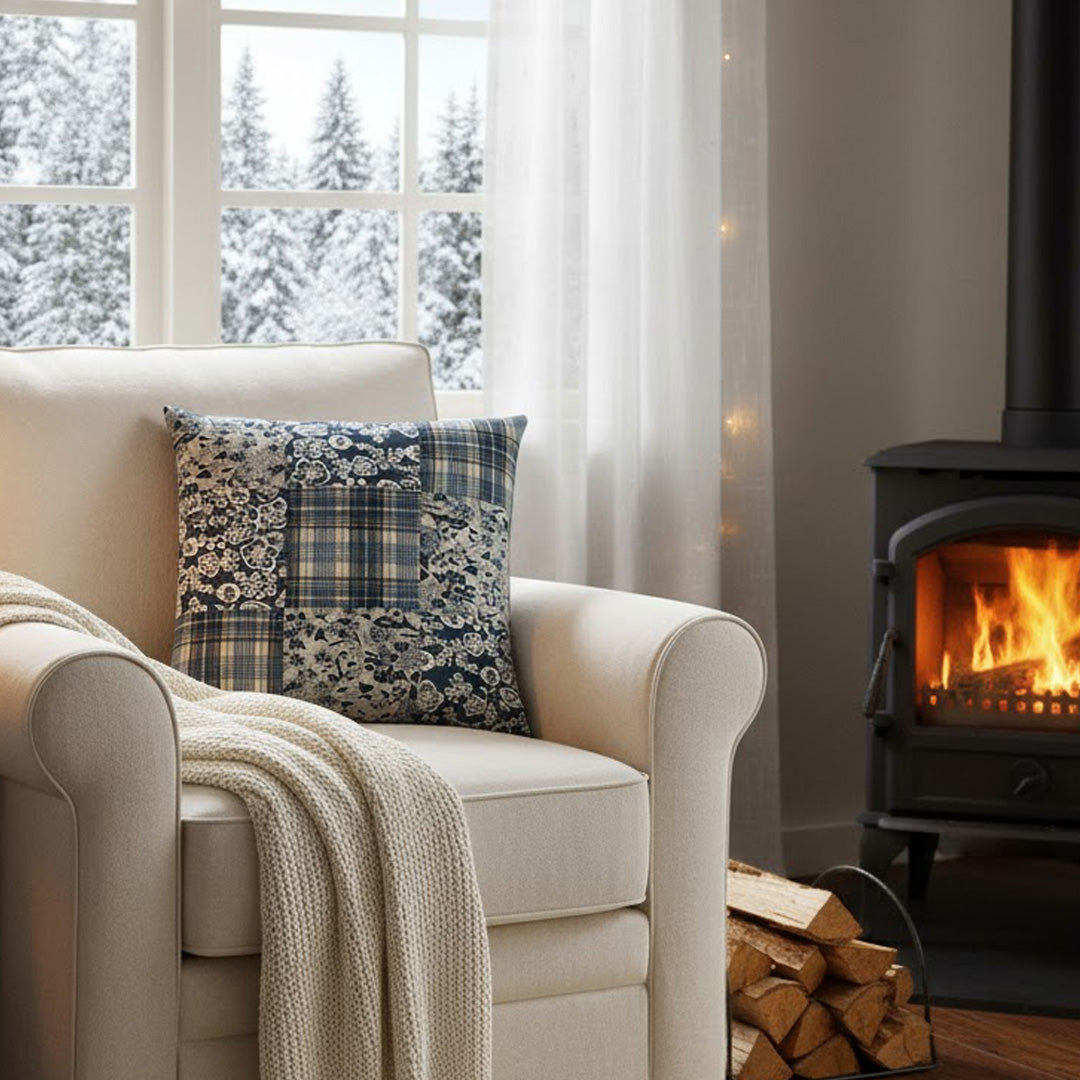 Handgequilteter Patchwork-Kissenbezug in Dunkelblau, 50x50 cm
