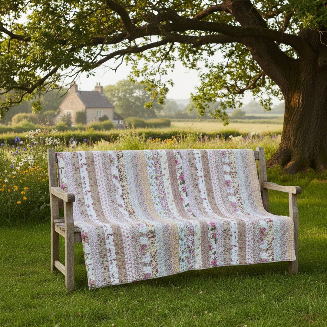 Bringen Sie Wärme, Farbe und romantische Atmosphäre in Ihr Zuhause mit der Patchwork-Bettdecke in Blumenfarben. Diese große, handgequiltete Decke kombiniert zahlreiche florale Muster in zarten, warmen Tönen. Die vertikal angeordneten Patchwork-Streifen schaffen ein harmonisches und elegantes Gesamtbild, das Ihrem Schlafzimmer einen gemütlichen und liebevollen Charakter verleiht.