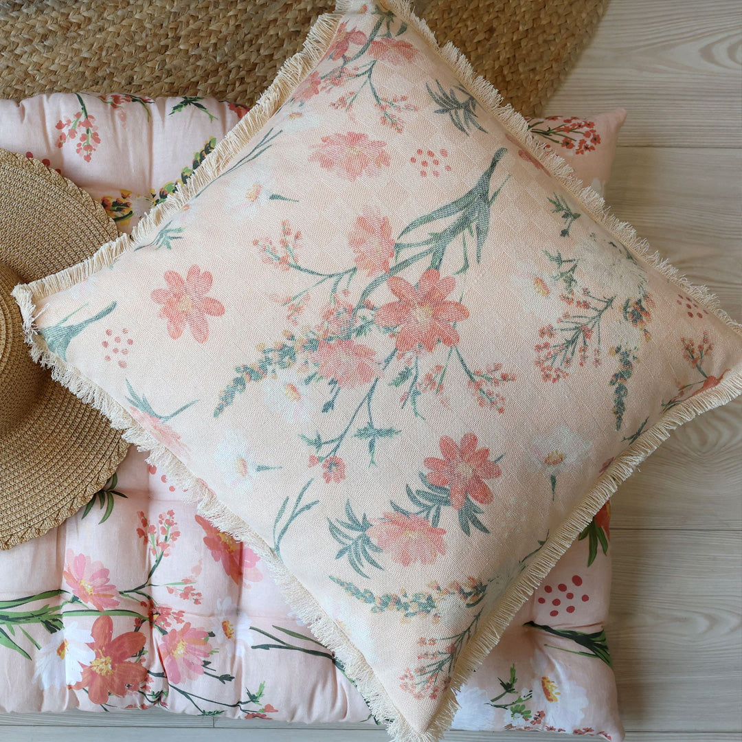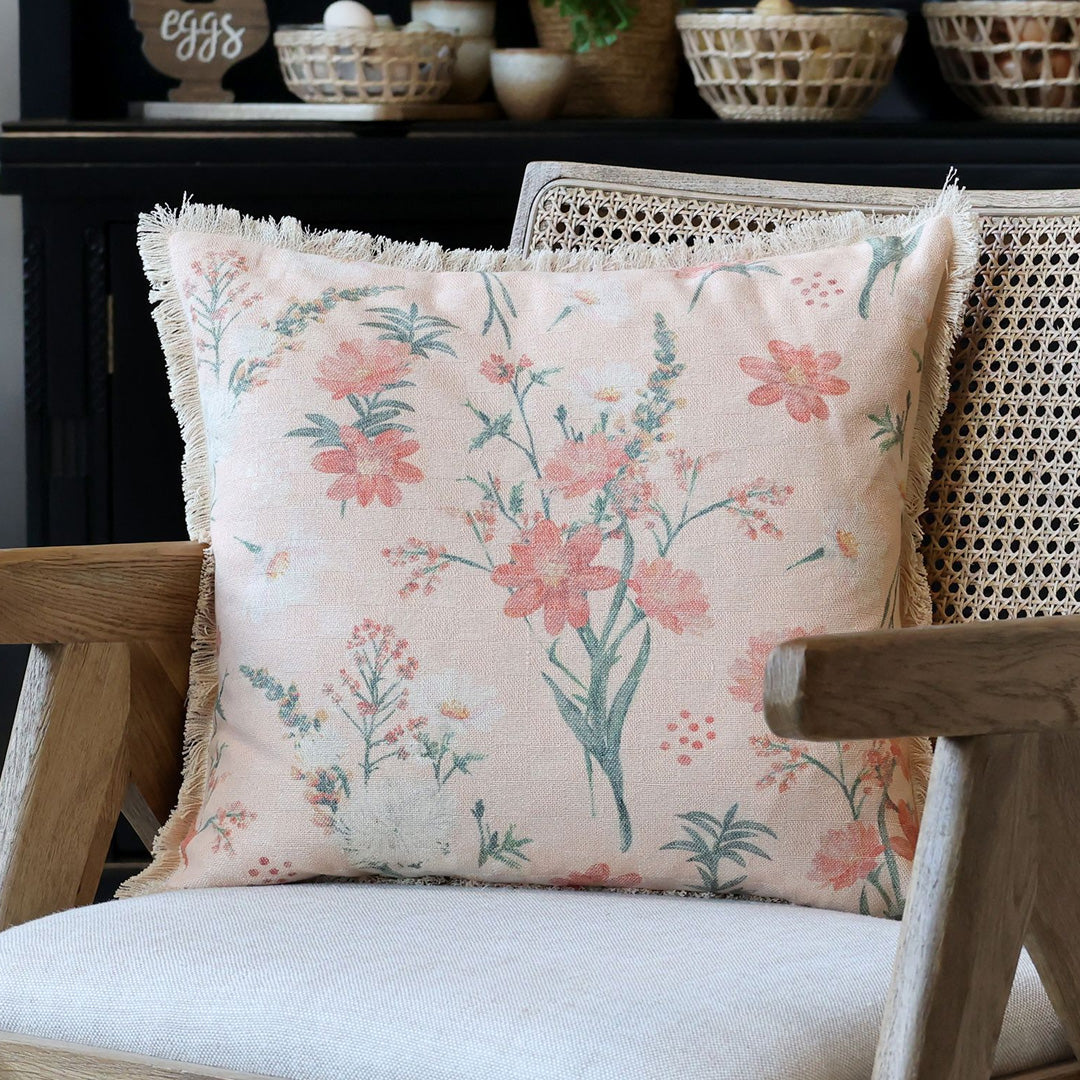 Kissenbezug mit Fransen & Blumenmuster – Rosa 50×50 cm