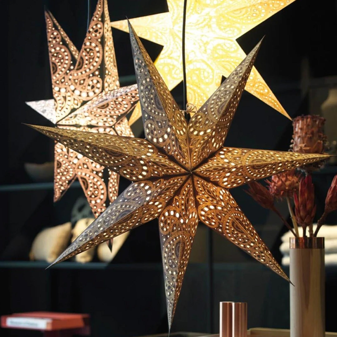 Die Kashmir Schwarz ist ein edler Papierstern in Schwarz mit detailreichen Mustern und eleganten Ausschnitten, die beim Einschalten ein warmes und stimmungsvolles Lichtspiel erzeugen. Der dunkle Hintergrund hebt die hellen Muster hervor und sorgt für einen dramatischen Kontrast – ideal für moderne ebenso wie für klassische Einrichtungen.