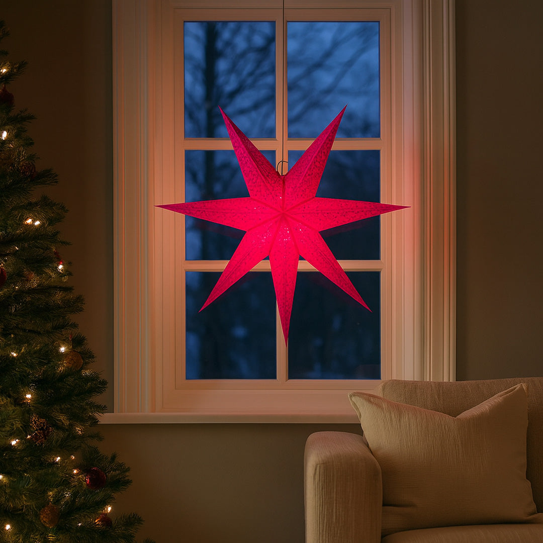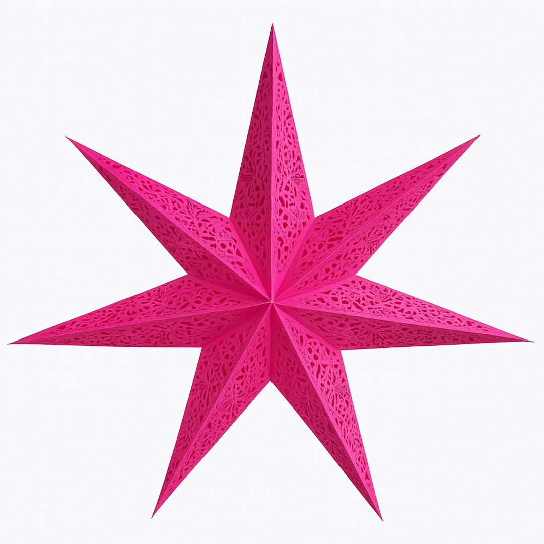 Die Siluett Berry ist ein lebendiger Papierstern in einem intensiven Pinkton mit kunstvoll ausgeschnittenen Mustern, die beim Einschalten ein elegantes Spiel aus Licht und Schatten erzeugen. Die kräftige Farbe macht den Stern zu einem markanten Blickfang, der jedem Raum Wärme und Energie verleiht.