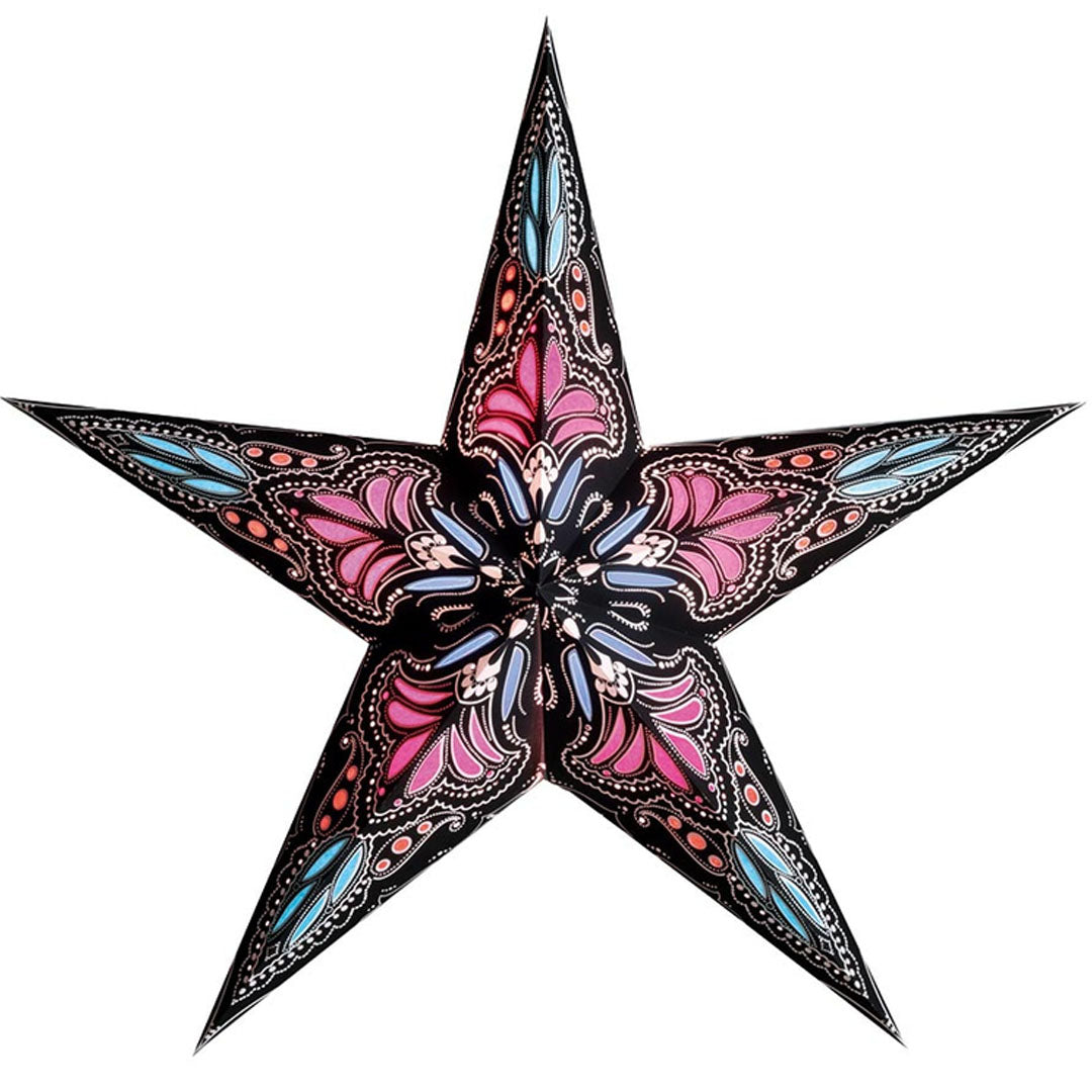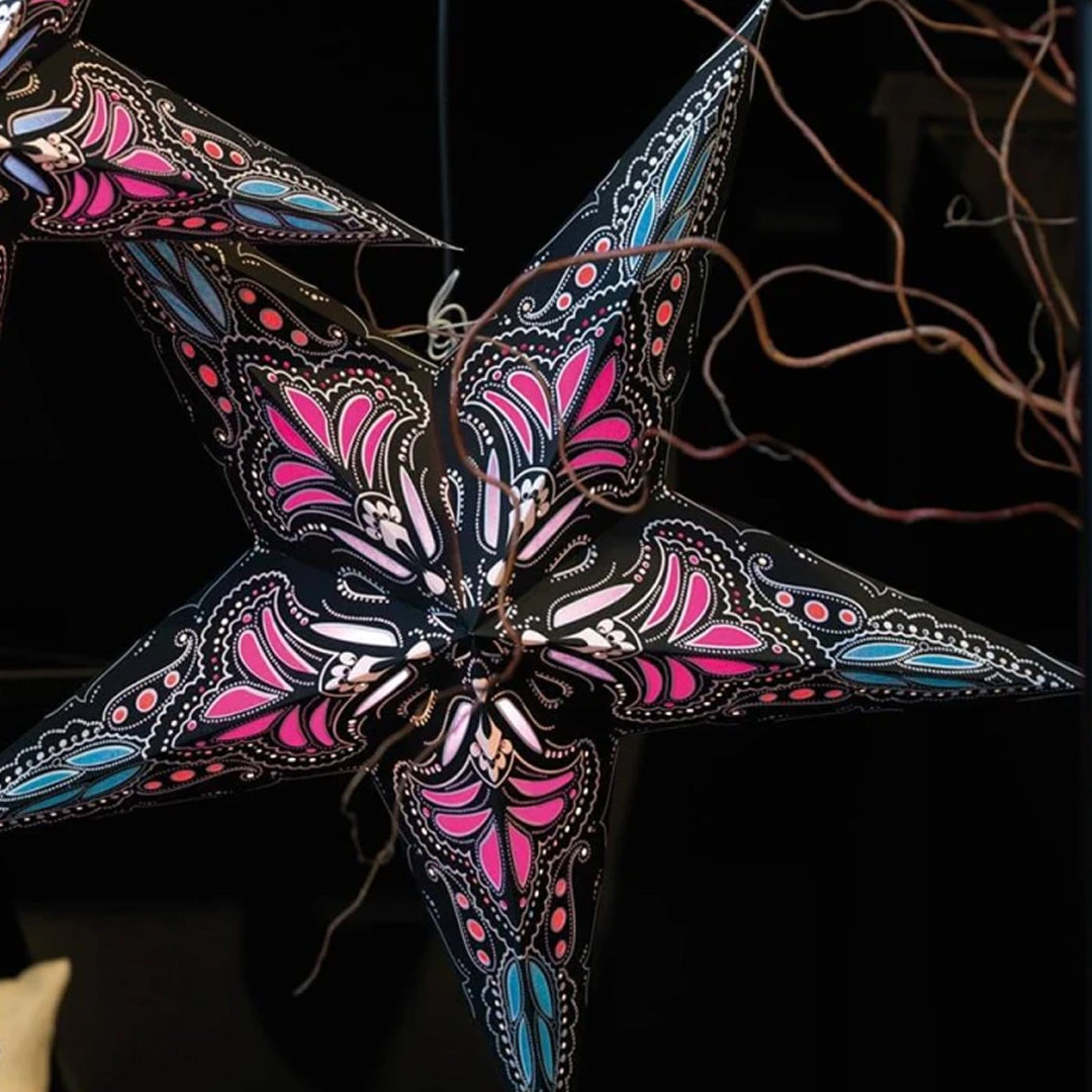 Die Jaipur Schwarz Pink ist ein kunstvoll gefertigter Papierstern in Schwarz mit detailreichen Mustern in Pink-, Blau- und Rottönen. Die feinen Ausschnitte erzeugen beim Einschalten ein faszinierendes Spiel aus Licht und Schatten, das jedem Raum eine besondere Atmosphäre verleiht.