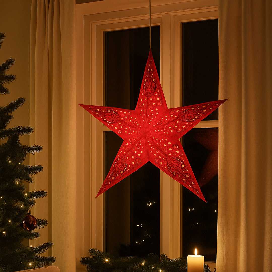 Die Mono Rot ist ein ausdrucksstarker Papierstern in kräftigem Rot mit eleganten Mustern und feinen Ausschnitten. Beleuchtet entsteht ein warmes und lebendiges Lichtspiel, das für eine gemütliche und einladende Atmosphäre sorgt.
