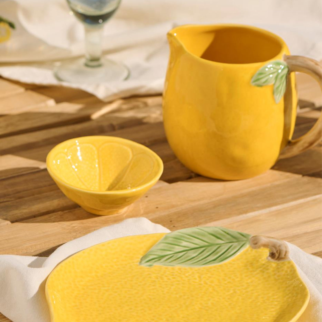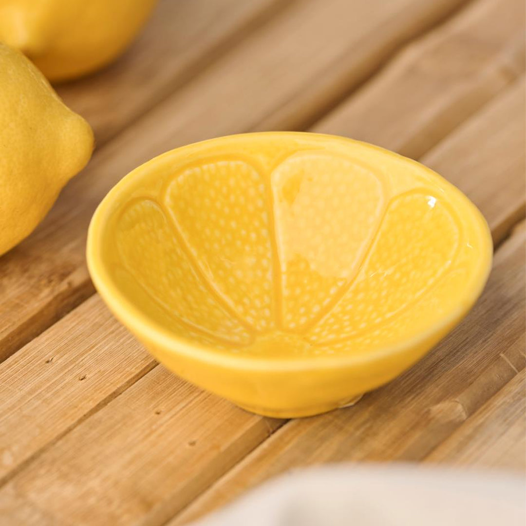 Dekorative Mini-Schale aus Steinzeug mit zitronen-inspiriertem Design in klarer, gelber Farbe. Die Schale verleiht dem Tisch ein frisches und verspieltes Aussehen und ist perfekt für kleine Portionen, Snacks, Dips oder als dekoratives Element auf dem Tisch. Durch ihre kompakte Größe ist sie ideal sowohl für den Alltag als auch für festliche Anlässe.